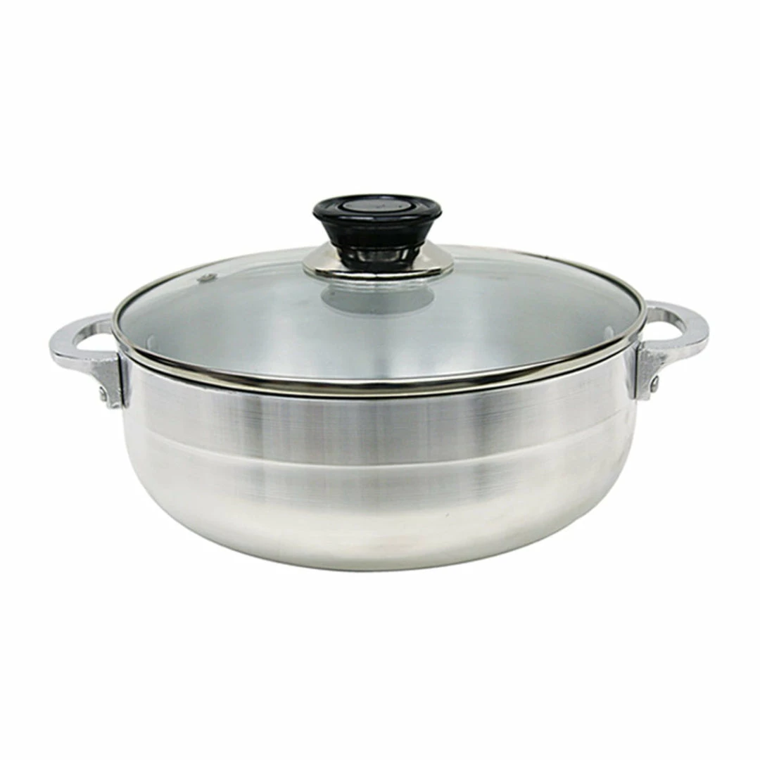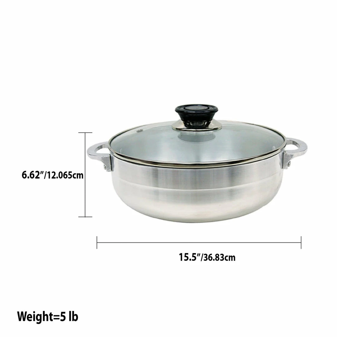Perfect for cooking a wide range of meals, this caldero is a great essential for cooking meat, rice and other dishes. This heavy duty cooking must-have features an aluminum satin finish for even heat distribution and beautiful presentation. The clear glass lid locks in flavor and provides an easy view of your culinary creation. Rounded handles makes it easy to transfer it from the oven and onto a trivet, or sink.