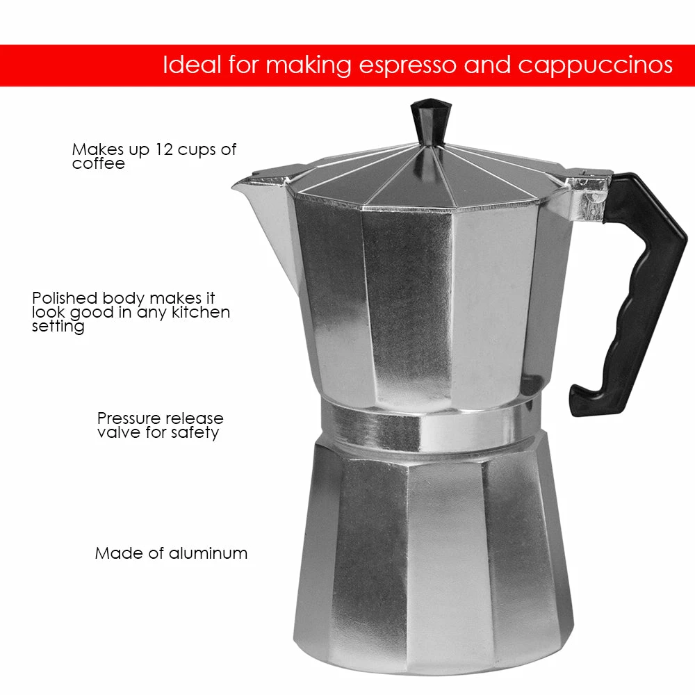 No need to take a trip to your local cafรฉ to enjoy the velvety smooth taste of your favorite espresso! You. Craft your very own in the comfort of your own kitchen with the help of this stove-top aluminum espresso maker. Boasting the traditional eight-sided octagon design, the premium quality aluminum construction allows it to distribute heat evenly and enhance the overall flavor of your favorite brew within minutes. Perfect to use this stovetop in the home or office.