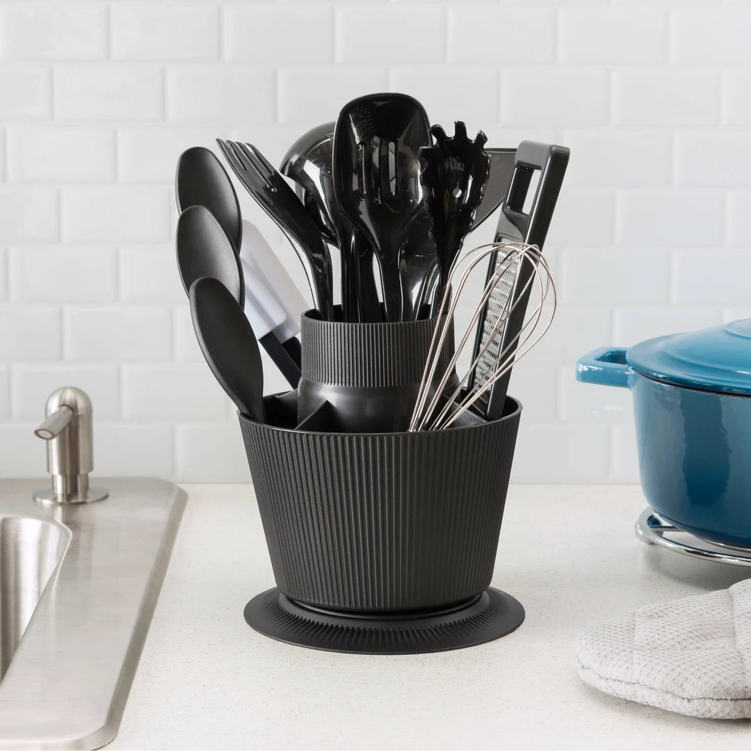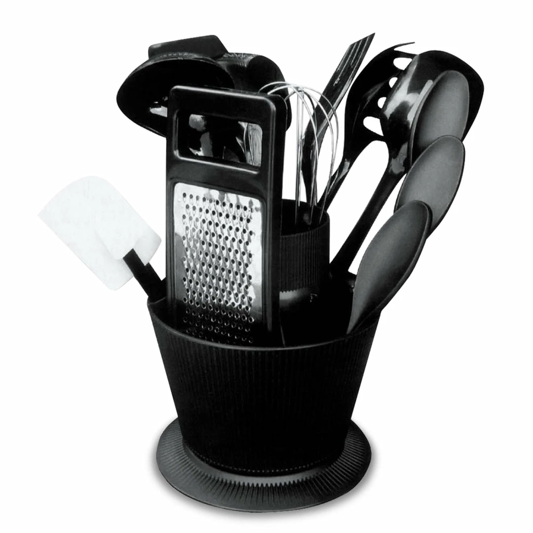 - 14 piece set includes – soup ladle, serving spoon, slotted turner, fork, pasta server, mixing spoons, spatulas, whisk, grater, and revolving storage crock