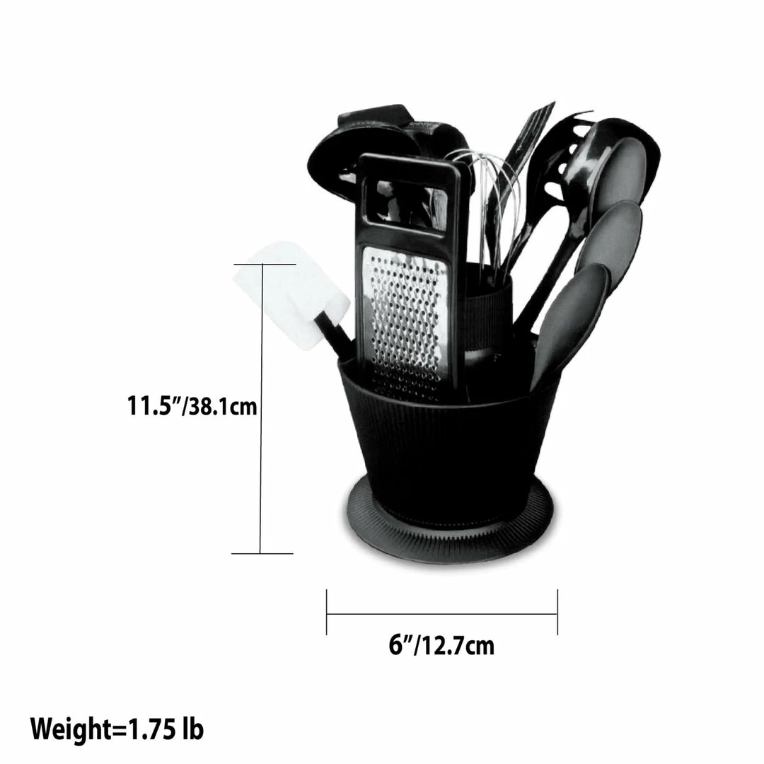Create the perfect meal with this Home Basics Kitchen Tool Set. Set includes – 11″ soup ladle, 11″ serving spoon, 11″ slotted spoon. Slotted turner, 11″ fork, 11″ pasta server, 11″ mixing spoon, 9.5″ mixing spoon, 7.5″ mixing spoon, two 9 1/4 spatulas, whisk, grater. And revolving storage crock. Dishwasher safe.