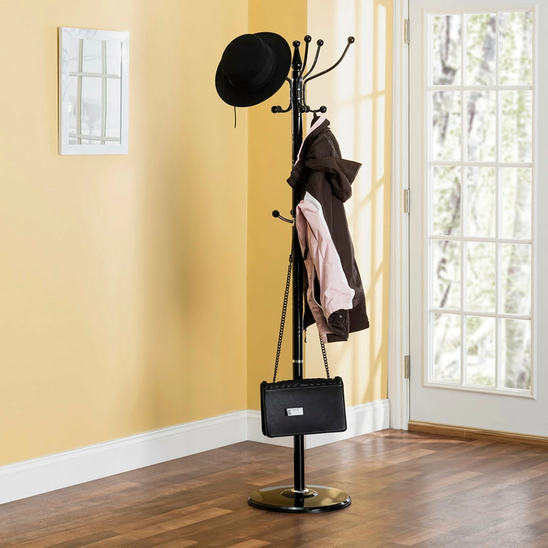Stylishly elegant this standing coat rack brings order and a neat appearance to home entryway or an office lobby area. With 16 hooks and high strength branches guests, kids and adults alike, employees, and customers can drape their heavy winter jackets, handbags, totes, backpacks, scarves, and more. The 65 inch high center post is supported by a weighted circular base that keeps the rack securely to the ground.