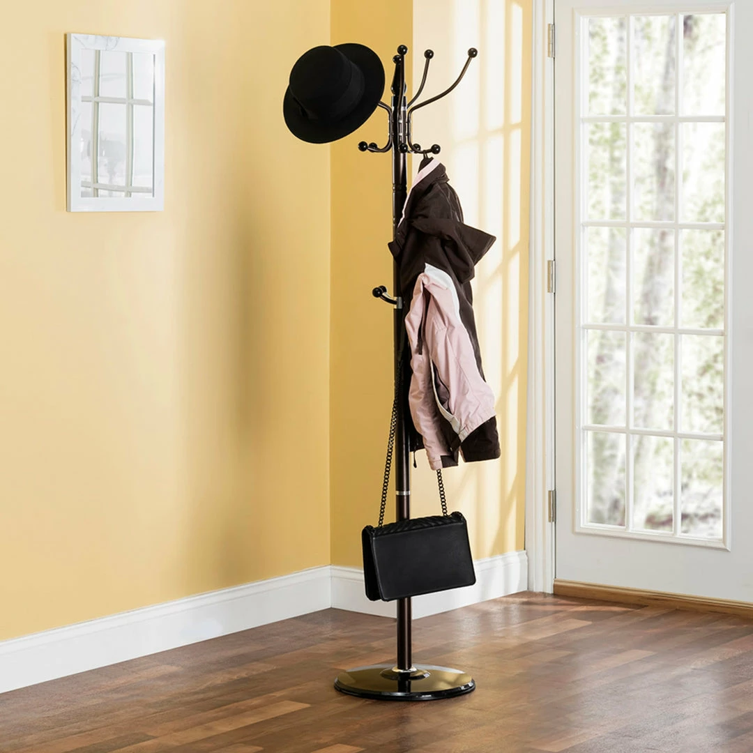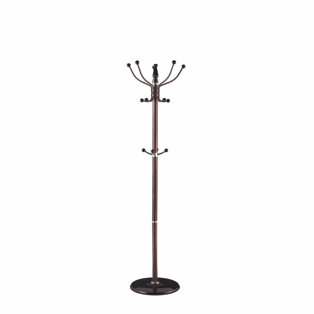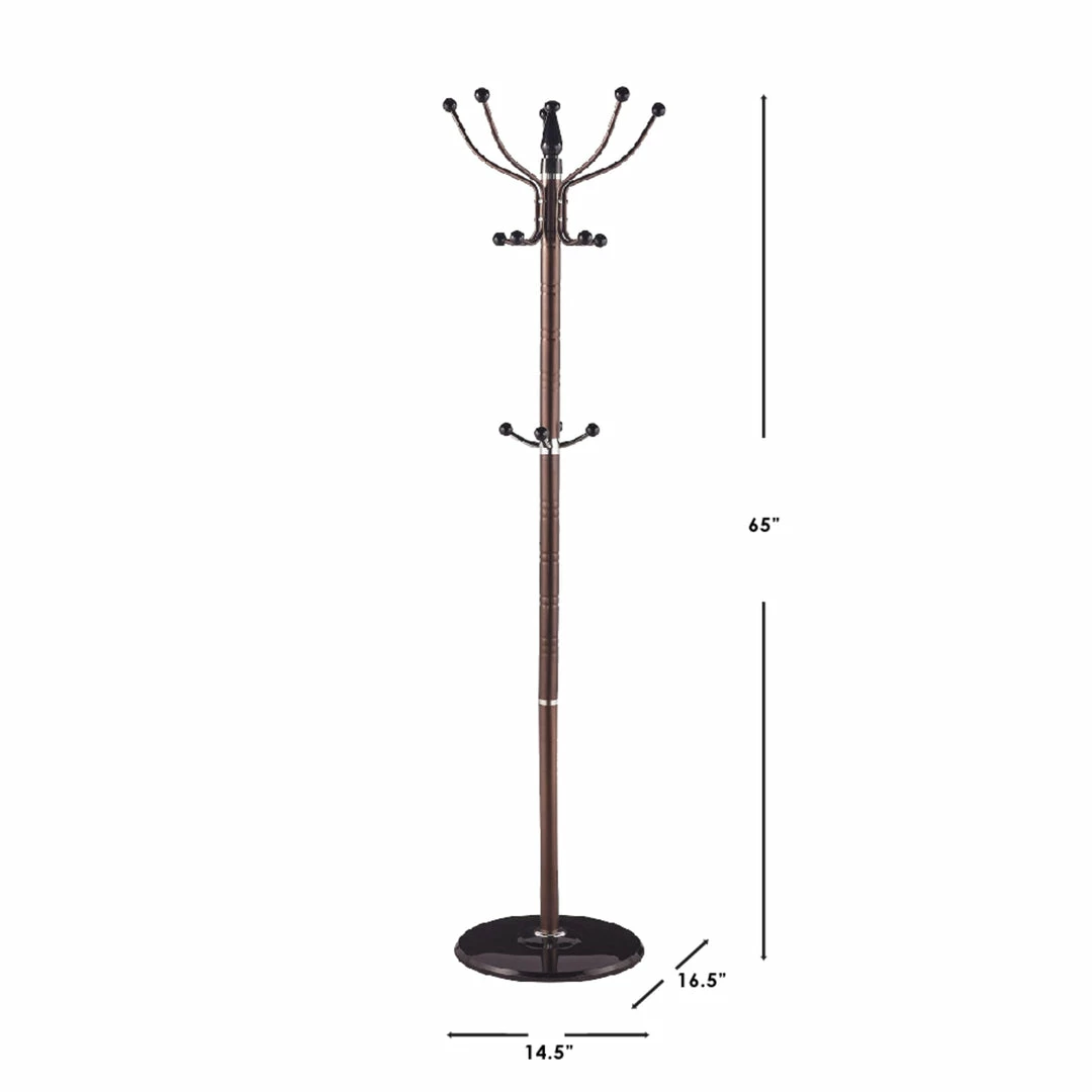 Stylishly elegant this standing coat rack brings order and a neat appearance to a home entryway or an office lobby area. With 16 hooks you have plenty of storage to organize clothes, hats and scarves. The 65 inch high center post is supported by a weighted circular base to keep it place. Item dimensions may differ slightly due to the unique nature of the product. Color and finish may also differ from the images shown due to differences in monitor displays. Props and accessories are not included.