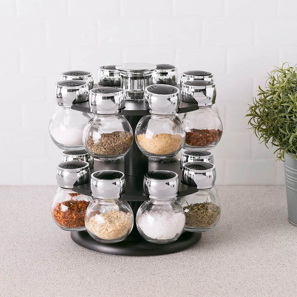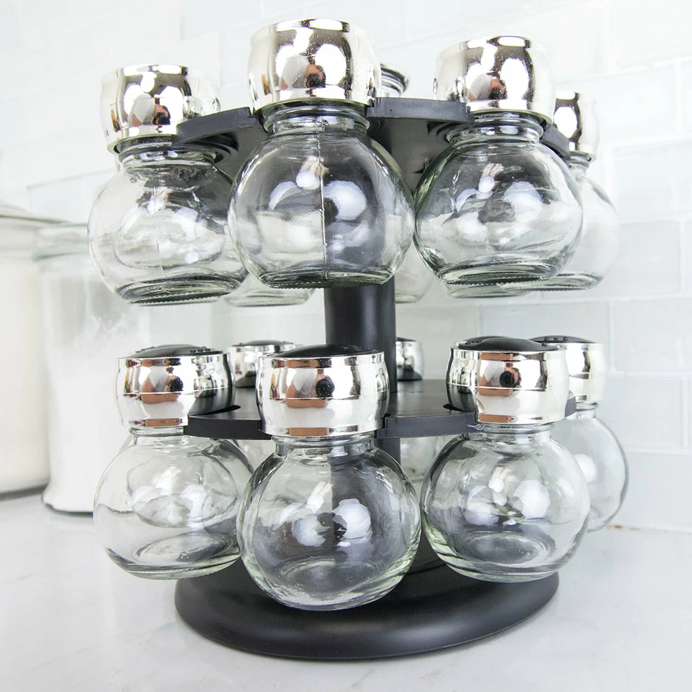 Spice up your kitchen with a modern charm by organizing your favorite, flavorful and aromatic seasonings and herbs in this two tier revolving spice rack.The center knob rotates the base to make it easy to select your favorite spices or herbs. Spices and seasonings not included. The two tier design holds up to 16 glass spice jars. Flip-top lids smoothley dispenses spices in a subtle manner to prevent over pouring. Made of glass and steel.