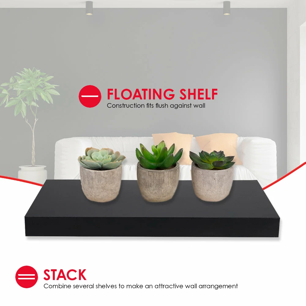 Transform bare walls and ignite sparkling conversation with this beloved floating shelf. A piece of art as it is a storage item, itβs a handy helper in keeping the clutter from getting out of control. With itβs streamline and clean design, the shelf is a functional and stylish addition to any room of the house. Line up your favorite reads, pretty statuettes and figurines along the top of the shelf to liven up the living room. Or mount on the wall in the bathroom to tidy up and manage the overflow of toiletries and bath accessories. The shelf is built to last and constructed with the highest quality MDF and metal components. Sitting flush against the wall, the shelf keeps hardware from being exposed, bringing a beautiful and clean look to any space. It comes complete with screws and a mounting bracket, allowing you to install the shelf within minutes. To install the unit, use a stud finder to locate the studs and to determine the placement of the shelf. Draw light pencil marks on the wall as a guide. When the final placement of the shelf is determined, use a screw driver or drill to secure the included bracket . Check to see that the shelf is level and make the necessary tweaks and adjustments before adding in the final screws. With brackets in place, slide the shelf broads onto the bracket. Lock it in place by tightening the screws underneath each shelf. Then decorate and enjoy to your liking. Simply wipe clean with a damp cloth. Item dimensions may differ slightly due to the unique nature of the product. Color and finish may also differ from images shown due to differences in monitor displays. Props and accessories are not included.
