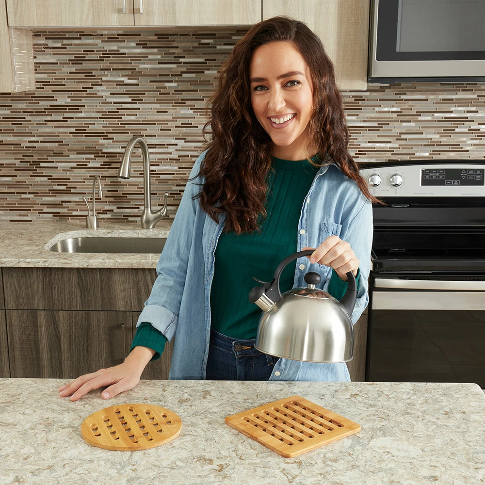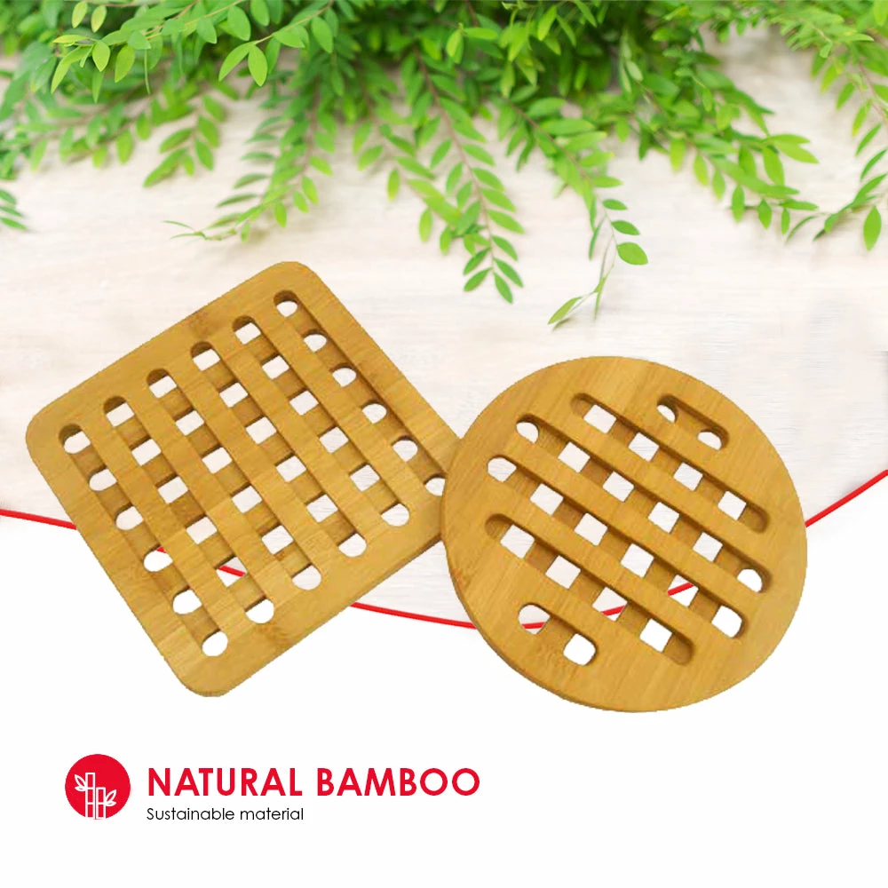 Whether for your traditional tabletop or coastal inspired countertop, this bamboo trivet set is perfect to keep your surfaces safeguarded from scratches and burns. This set comes complete with one square and one round trivet to accommodate piping hot pots, pans, and dishes of varying shapes. Use it to display your straight-from-the-oven meals or as an eye catching decorative accent piece. Intricate woven details along the surface of the trivets promote air flow beneath piping hot pans, while also lending a warm alluring aura to everyday dining and formal occasions. Hand wash to clean.