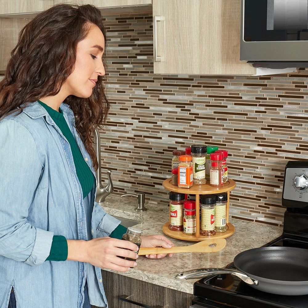 Forget wasting time rummaging through cramped cabinets to find what you need. Have everything from fresh bottled seasonings on hand for cooking and your favorite condiments accessible for dispensing with this convenient lazy Susan. The two tier turntable features an all natural bamboo finish that sits perfectly on any styled tabletop. The smooth rotation makes it quick and easy to grab items, so you can focus on what matters most – enjoying and preparing your meals. Raised rim keeps any items you place on its two spacious tiers from falling off as you give it a spin Hand wash with warm water and mild soap. Dry thoroughly with a soft towel. Apply canola oil to preserve shine. Assembly is required. Item dimensions may differ slightly due to the unique nature of the product. Color and finish may also differ from the images shown due to differences in monitor displays. Props and accessories are not included.