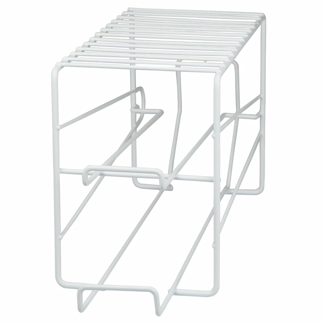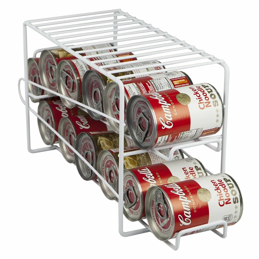 Instead of rummaging through your cramped fridge to grab your favorite soda opt for a specific area within your kitchen pantry or refrigerator to keep your canned food/beverages in place with this metal can dispenser. The two tier design neatly stores up to 11 cans horizontally for easy visibility and organization. Store everything from soda cans, canned soup, vegetables and more. Made of steel, it features a vinyl coated finish to prevent rust.