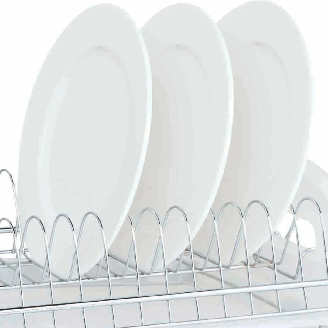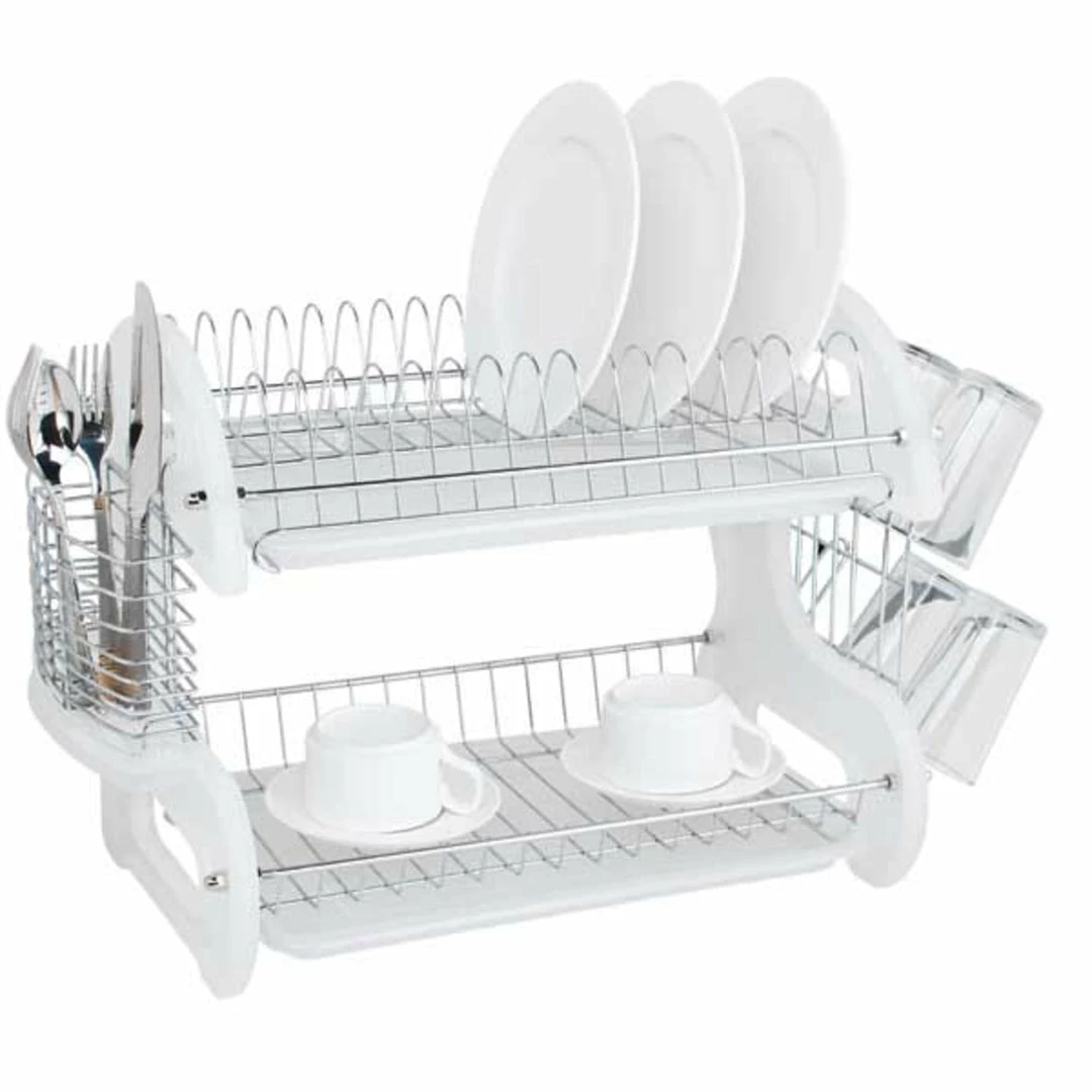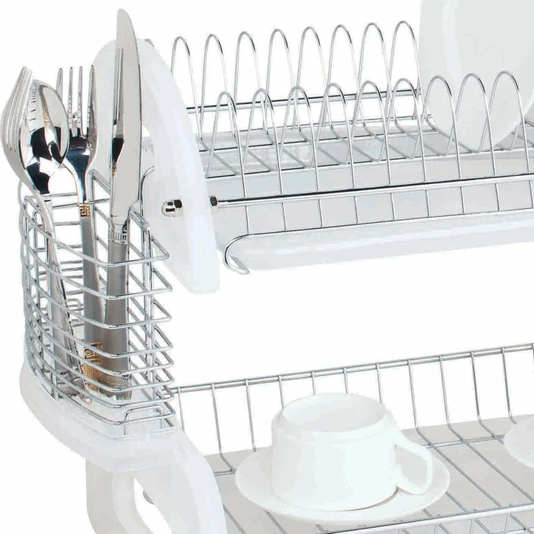 Never deal with the hassle of towel drying every single dish with this two tier dish drainer. The two tier design provides ample space to store and air dry dishware. Use the top tier to neatly stack plates and the bottom tier to place mugs or bowls, and other dishware flat. The side mounted mug stand holds multiple cups at an angle for easy viewing. The side mounted cutlery holder features a spring-like design to easily drain water for efficient drying. Two removable trays are included to keep your counter protected from the drips and leaks from damp dishes when drying. This means that you will never have to waste paper towels cleaning up any huge water spills. To clean the unit, simply hand wash the item with warm water and gentle soap. Dry thoroughly. Item dimensions may differ slightly from packaging due to the unique nature of the product. Please allow a slight deviation in measurement. Props and accessories are not included.