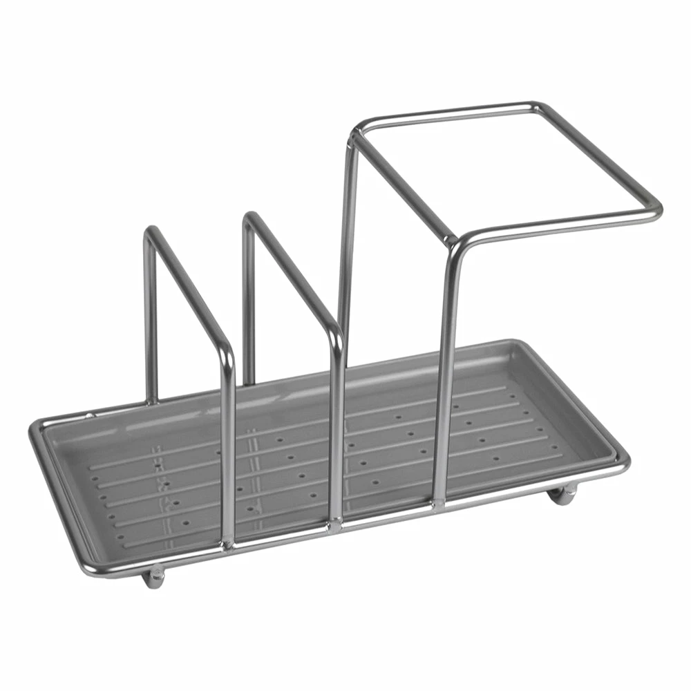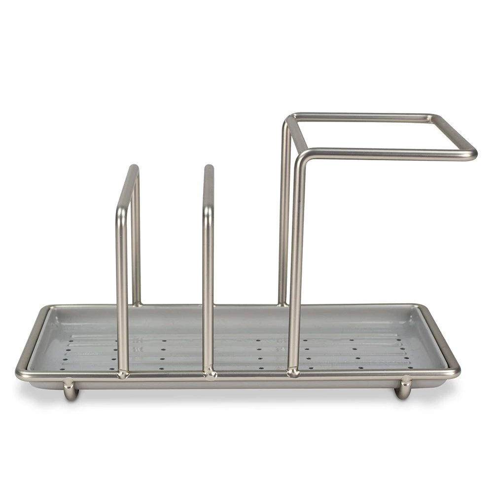 Keep your kitchen sink uncluttered, while having all your dishwashing essentials readily available with this convenient satin nickel sink organizer. 3 compartments allow you to organize sponges, dish soap, and more. Its open concept design cuts drying time in half. On the bottom, it features a removeable tray with ridges along the center to easily drain water. The slim design fits neatly in tight spaces without taking too much countertop space.