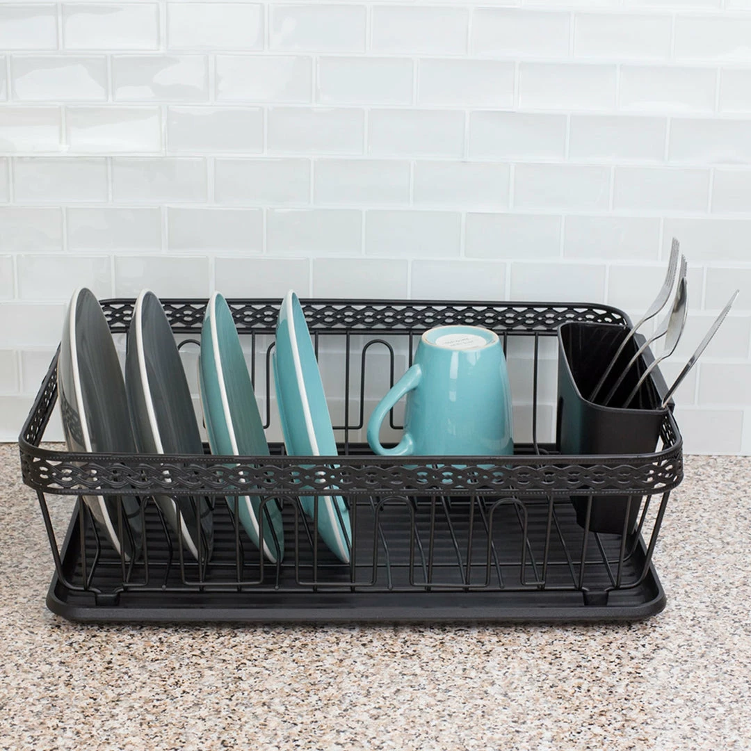 If you’re tired of the traditional stainless steel dish rack, opt to use this decorative steel dish rick in a rich, black finish to dazzle up your dishwashing routine with a dash of elegance. Featuring a solid and open steel frame to it is designed to drain every drip and drop of water from your heavy duty and damp dish load. It also features a larger compartment to neatly stack multiple plates and small compartment to hold up to two mugs. For a dish rack that perfectly combines refined aesthetics and functionality,than there is no better dish rack to display on your counter than this Home Basics Decorative Steel Dish Rack.