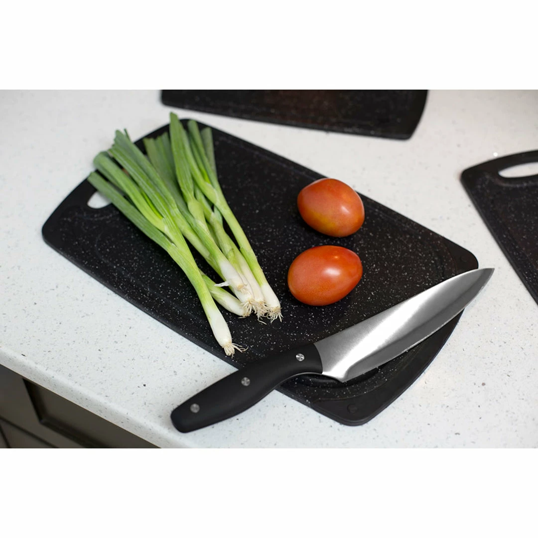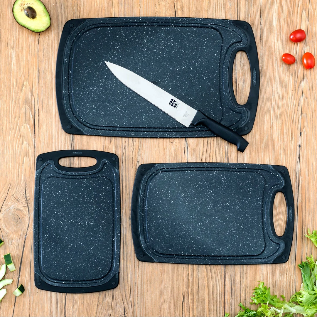 The richly, grained look of real granite with out the weight, this set of plastic cutting boards feature a double sided work surface that helps prevent cross-contamination and mixing of flavors. The set features 3 distinct sizes to fit all your food prepping needs, along with a deep groove lip around the edges for catching excess juices. Each feature a thick and sturdy plastic construction with a gentle surface that is gentle on your knife’s edge. along with rubber sides to keep the cutting boards in place as you chop.