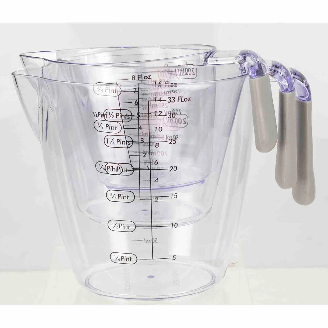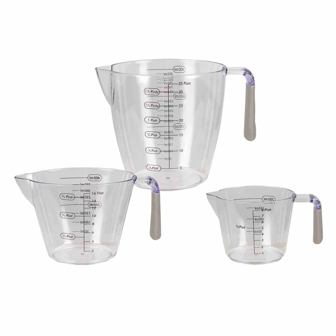 Whether you consider yourself a culinary connoisseur or a beginner chef, everyone knows that just the right amount of ingredients can make a difference from creating tasteless meals to a delectable and memorable cuisine your friends and family will enjoy. Achieve the best results when cooking with this 3 Piece Plastic measuring cup Set. The set includes 8oz/16oz/33oz transparent cups with measurements clearly printed on the front of the base for easy visibility. The ergonomic rubber handles provide a firm grip, while the narrow spouts ensure a smooth flow of ingredients with minimal mess when pouring. Ideal for both dry and wet ingredients, its a handy kitchen essential for all your baking and cooking needs!