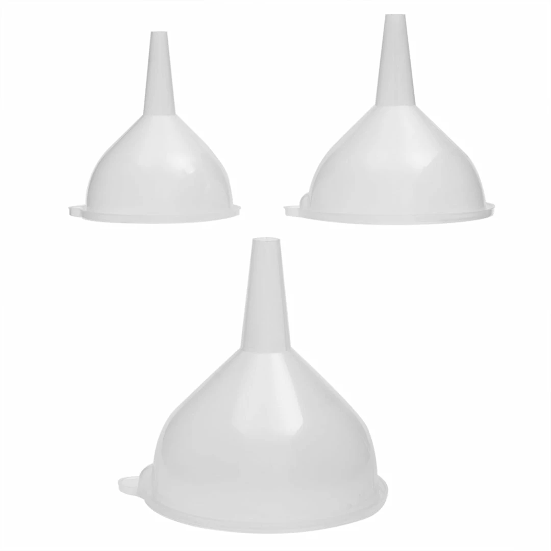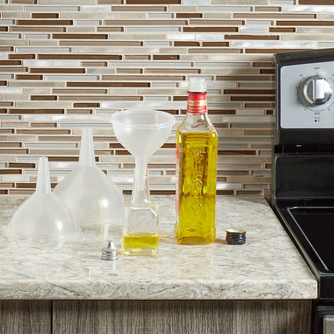Multiple sizes for serving different purposes. Each funnel features narrow spouts that can accommodate most bottle and containers without spilling. Easily transfer liquid substances such as sauces, dressings, soups and juices and oil. Or funnel out fuel or change oil in your car. Great gift for friends and family. This set of funnels will serve all sorts of needs around the home. The smooth plastic is very easy to clean. Hand wash the unit with warm water and use gentle soap. Dry thoroughly with a soft towel. Item dimensions may differ slightly due to the unique nature of the product. Color and finish may also differ from the images shown due to differences in monitor displays. Props and accessories are not included.