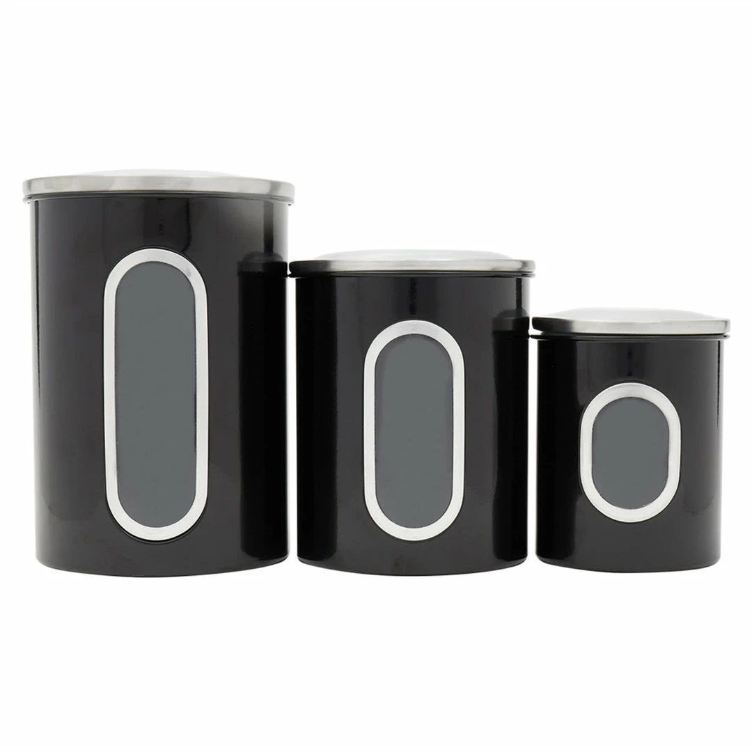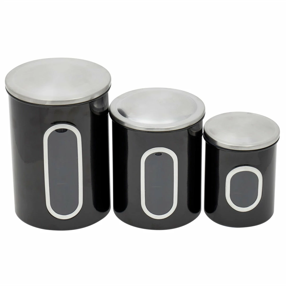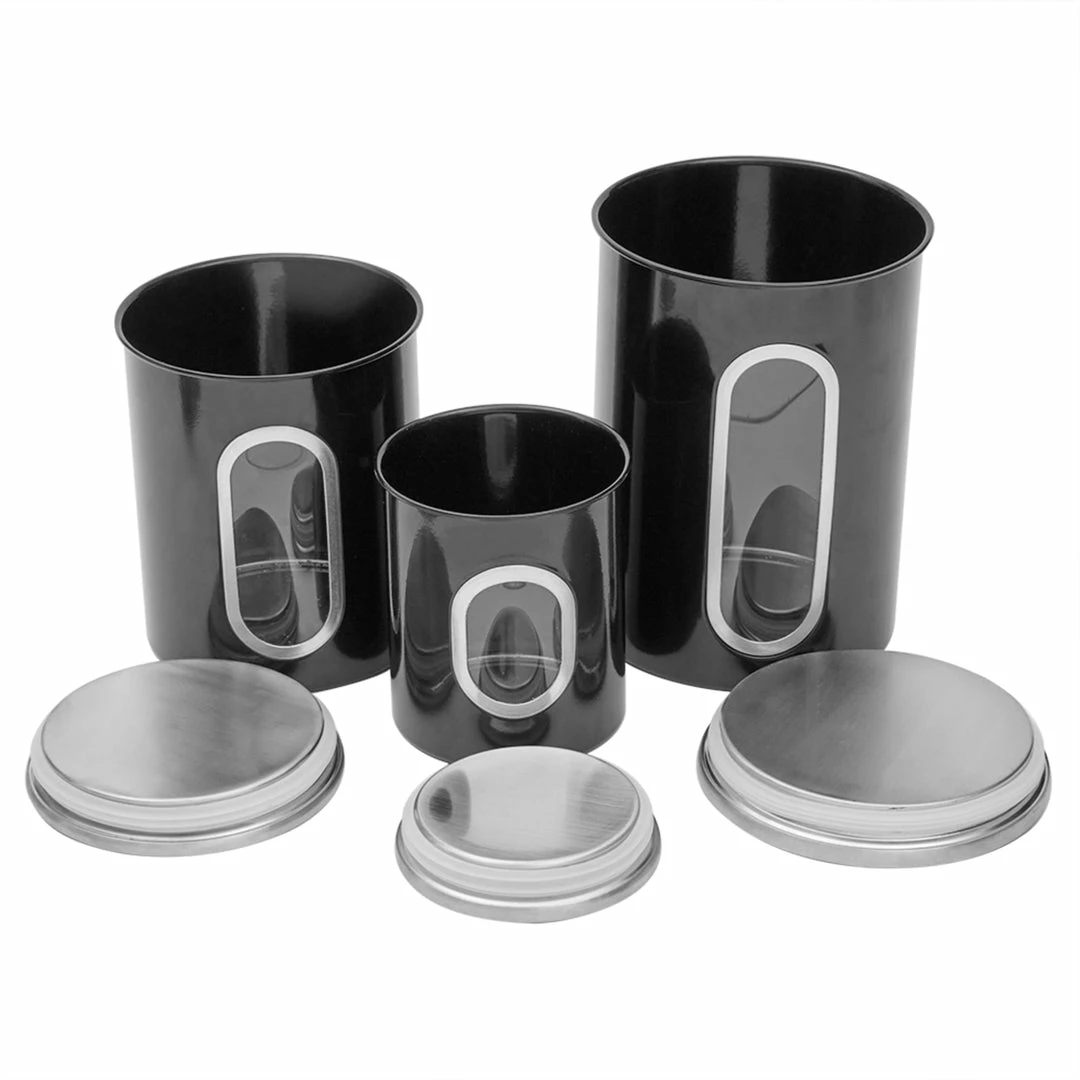 Get your favorite pantry staples in order with the help of this set of metal canisters. With clear windows along the center, seeing what you have at a glance is quick and convenient. Fill this set of empty canisters with your own dry ingredients and snacks. Set by your breakfast bar and fill each canister with sugar, coffee beans, and cereal. When you need to replenish your stash of dried goods, simply remove the top. Hand wash the unit with warm water and use gentle soap. Dry thoroughly with a soft towel. The small canister can hold up to 29.1 ounces, medium can hold 63.6 ounces, and the large can hold up to 93.4 ounces. Item dimensions may differ slightly due to the unique nature of the product. Color and finish may also differ from the images shown due to differences in monitor displays. Props and accessories are not included.