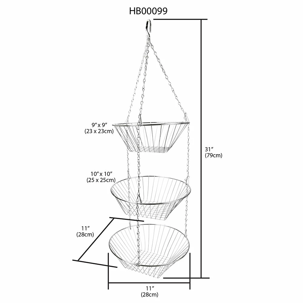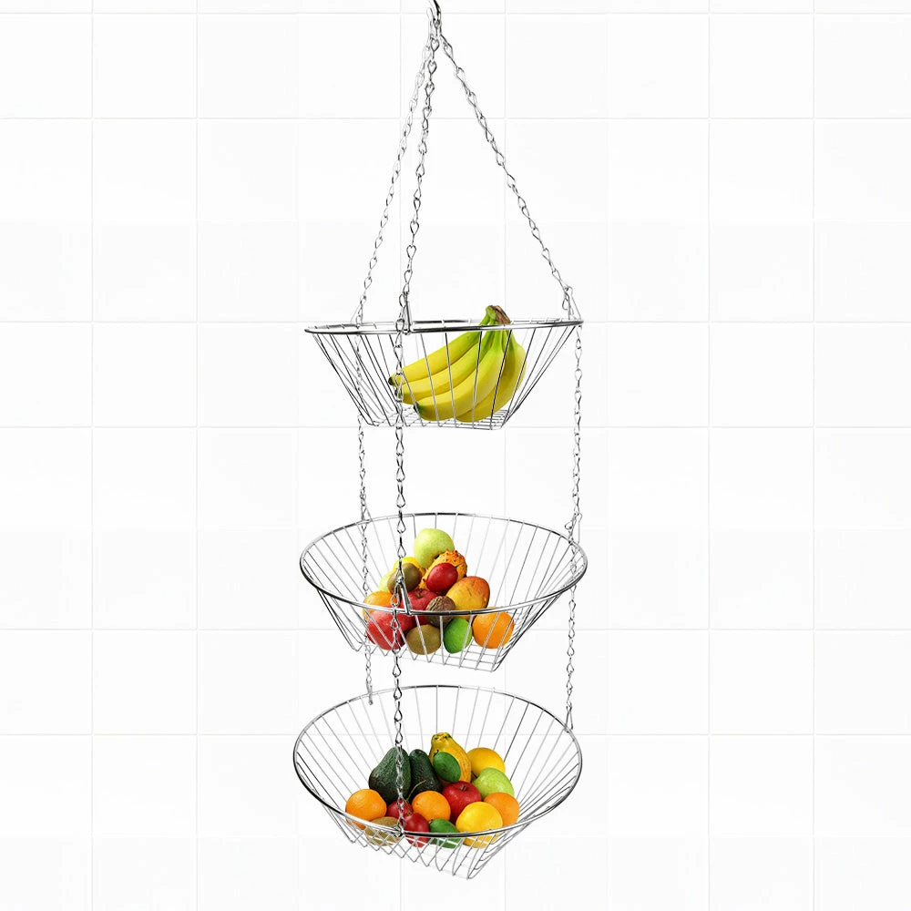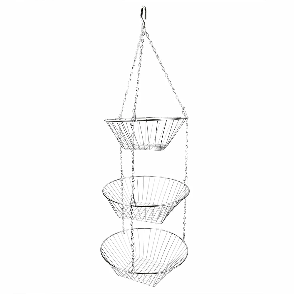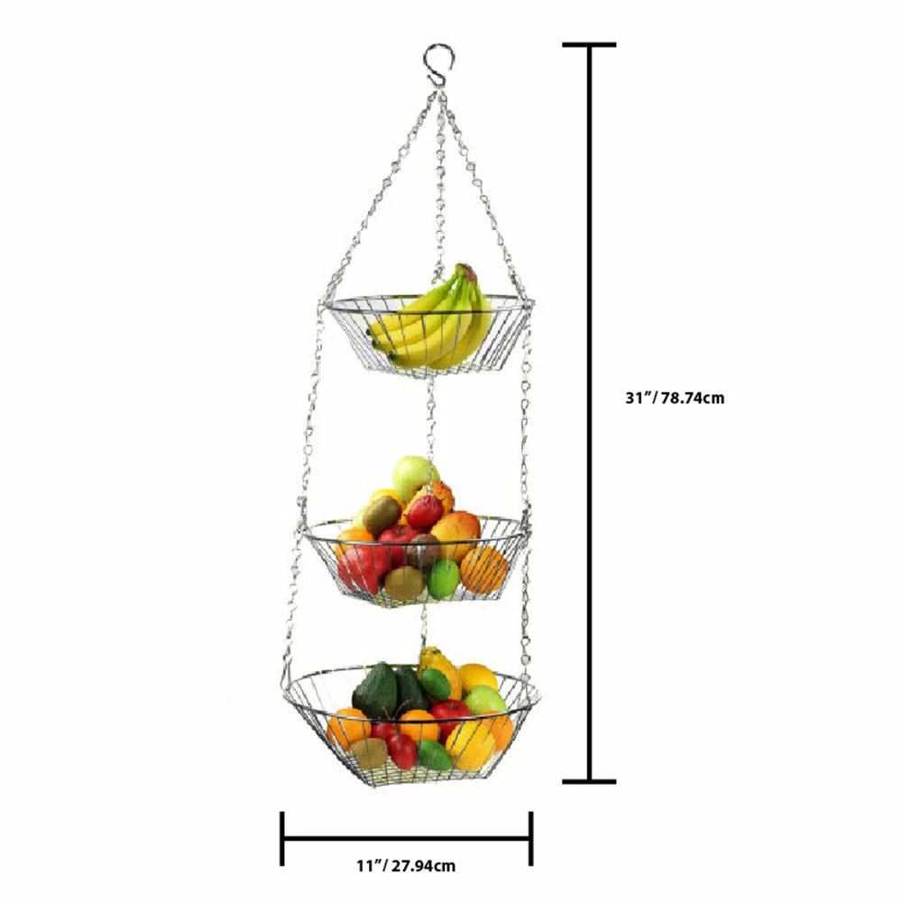 - 3 tiered hanging basket keeps fruits and vegetables fresh and household essentials close at hand
