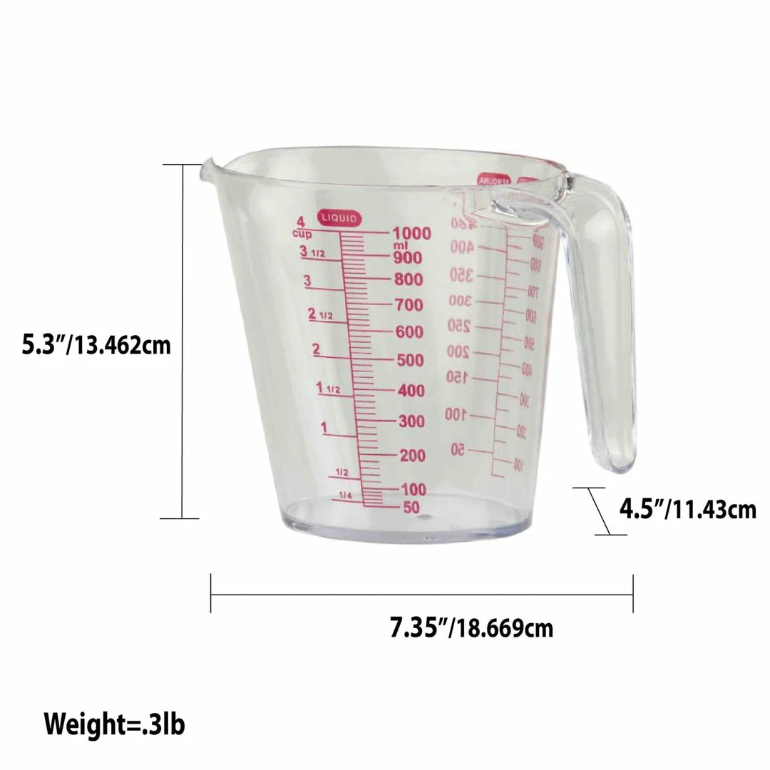 Bake to perfection with this plastic measuring cup. Made from high quality plastic. Side handle makes it easy to pour out ingredients. Holds 32 ounces of baking ingredients. Great for baking and baking and cooking. Top-rack dishwasher safe to make clean up a snap