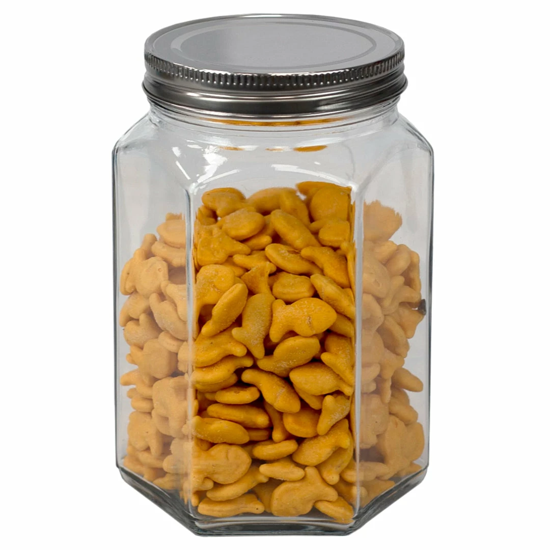 A unique take on the traditional glass jar and canister, this beautiful storage container features hexagon shape base that gives all your kitchen staples and favorite foods a gourmet look. The hexagon glass jar is toped with a snug-fit metal twist-on lid that keeps all the freshness inside. Great for cannning, use to store and jams, honey, and baby food. Or use to the stash herbs, spices, flours, and other dry ingredients. Fill it with candy or essentials for the perfect homemade gift or party favor.