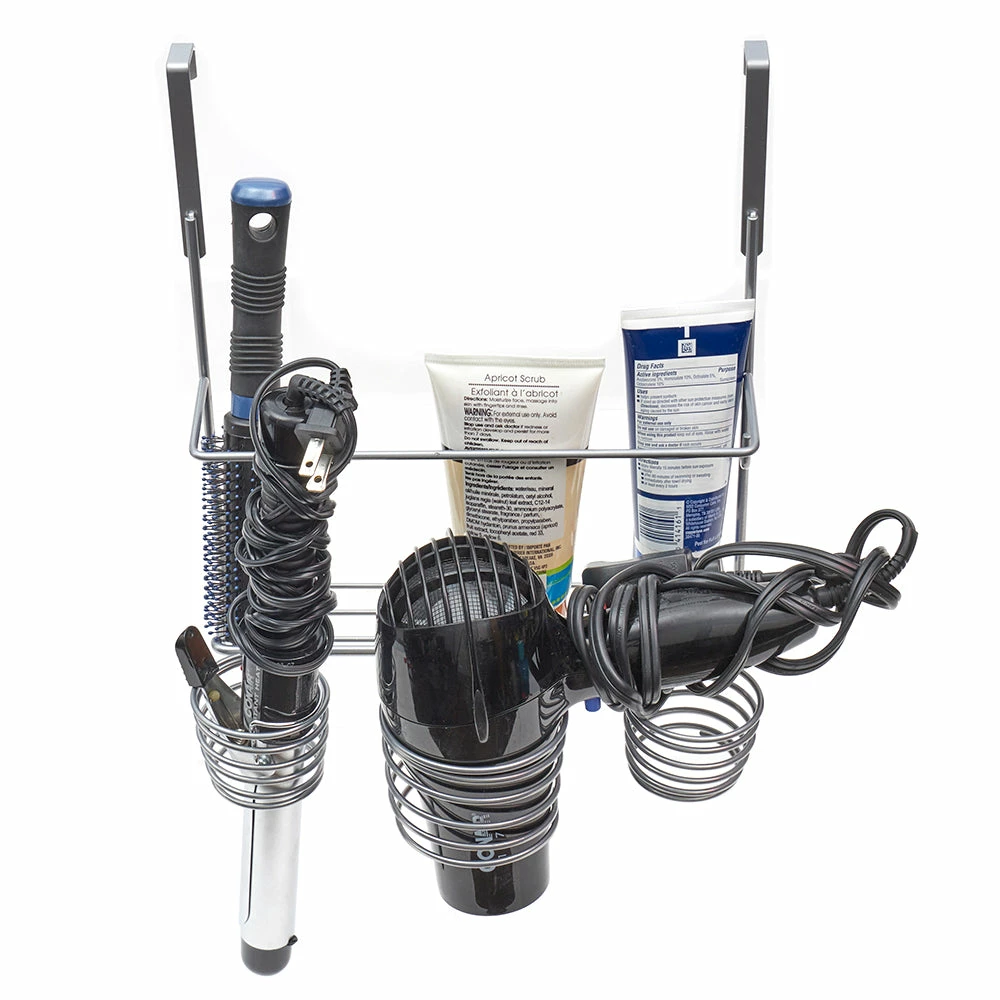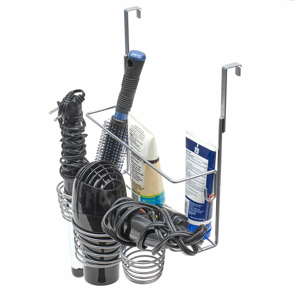 Nothing gets in the way of a great hair day when you have this convenient over the cabinet organizer to keep all your tools neatly organized! The organizer easily installs on an interior cabinet door, creating more space below the sink for bigger items like toilet paper. The heat-resistant steel frame allows for hot items such as curling irons, brushes, hair sprays, shampoos, soaps, and straighteners to be discreetly stored away and off the counters. With spring-like compartments and a basket to keep cords neatly arranged, youโre able to easily find exactly what you are looking for even during the morning rush. Just wipe clean for easy maintenance. Props and accessories are not included.