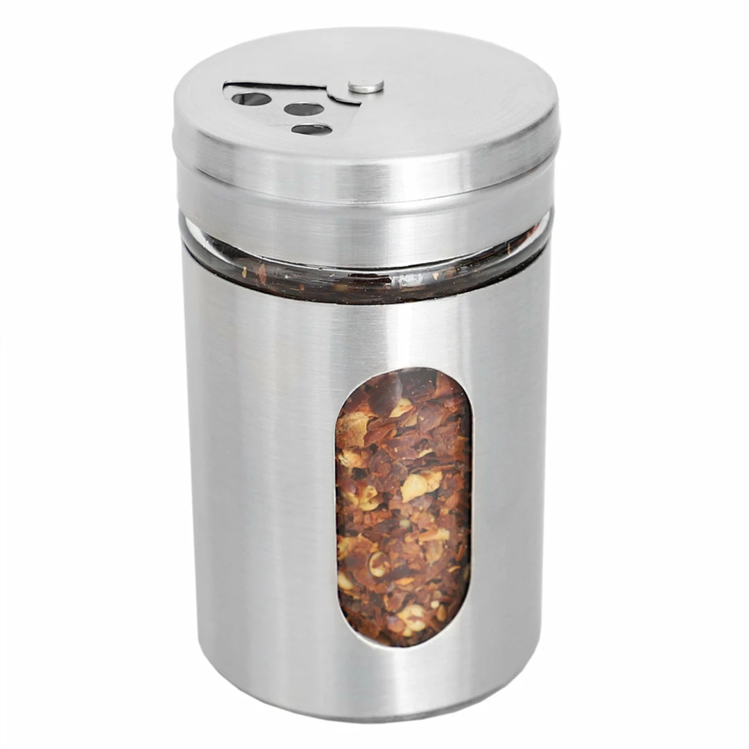 - 4 ounce stainless steel shaker with adjustable pour top and clear glass window