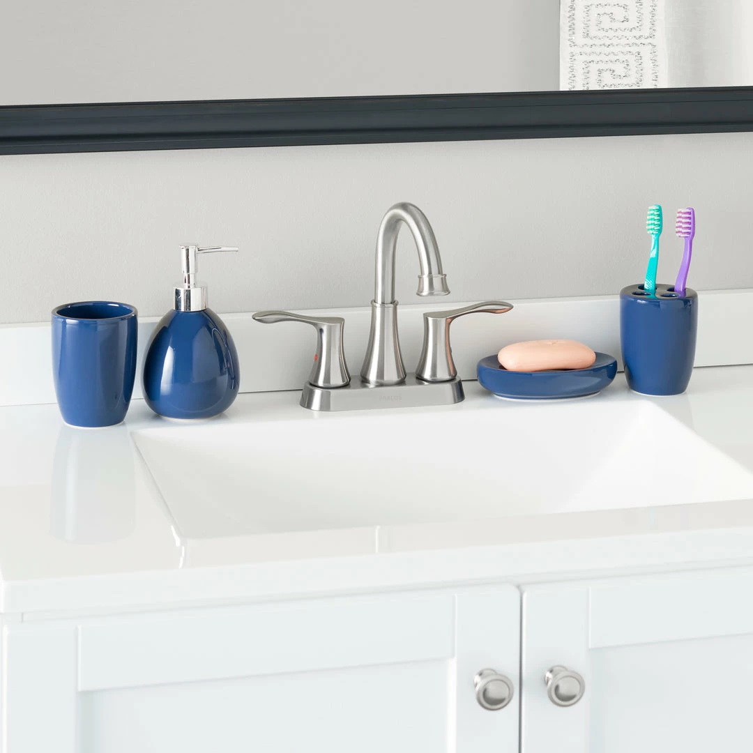 Grace your bathroom vanities with a modern flair by displaying this four-piece contemporary bath accessory set. This set includes all the essentials to get you through your routine, from the rounded lotion dispenser, generous size tumbler for rinsing or drinking, a large soap dish to store your favorite bar of soap, and 4 slot toothbrush holder to keep your toothbrushes organized. The beautiful matte finish and a simple design coordinates perfectly with virtually any bathroom style. Whether you need to dispense your favorite silky smooth and fragrant lotion or need to stylishly store away your toothbrush after cleaning that million dollar smile, this set provides the perfect blend of functionality and timeless style to your bathroom.