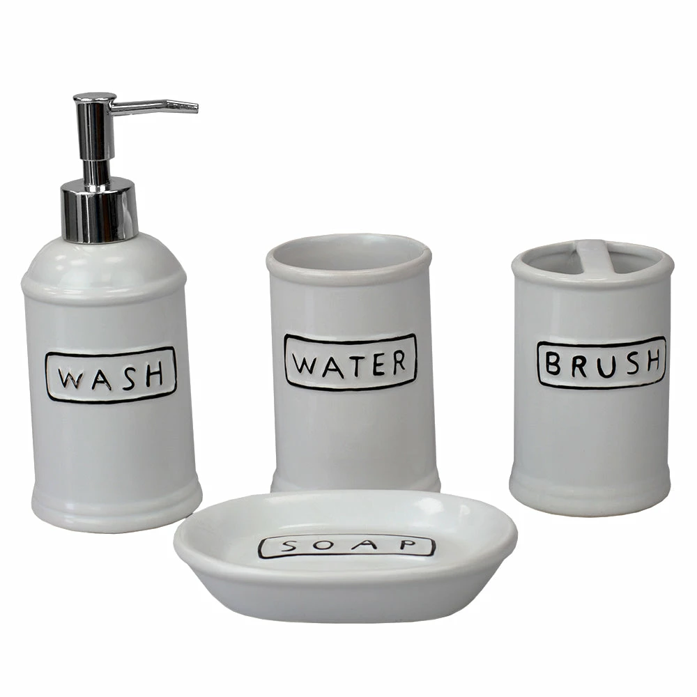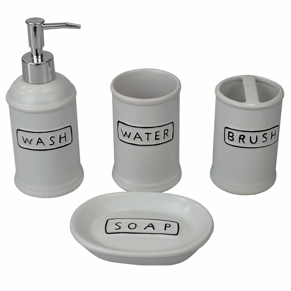 Bring simplistic comfort to your bathroom with this 4 Piece Bath Ensemble. The set comes complete with a lotion/soap dispenser, tumbler, toothbrush holder, and soap dish. Each piece is conveniently labeled so that you automatically know what is inside. This is perfect for a contemporary bathroom, because it will automatically blend in with the other décor and appliances. It is also great to go in a children’s bathroom, so that they can gain familiarity with the different bathroom essentials. Each piece is made from durable ceramic, which will provide long lasting use. Use not only for bathroom purposes, but the tumbler and toothbrush holder can also hold pens at your office desk, and the lotion dispenser can used for sanitizer and essential oils. The soap dish can even hold your small jewelry while taking a shower. The possibilities of this set are endless, and this can be kept to yourself or it is a great gift for friends and family. To clean, simply hand wash each piece. Props and accessories are not included.