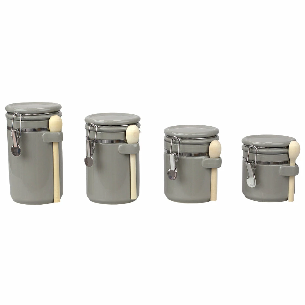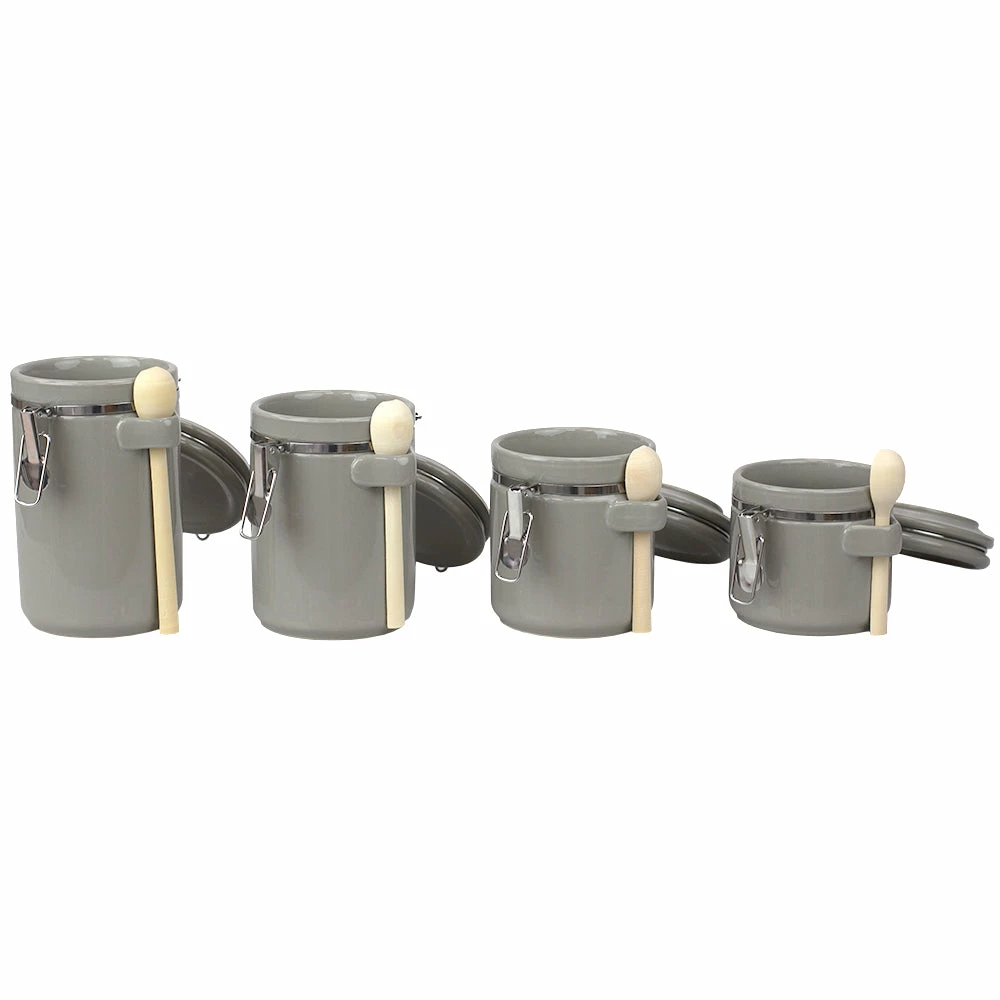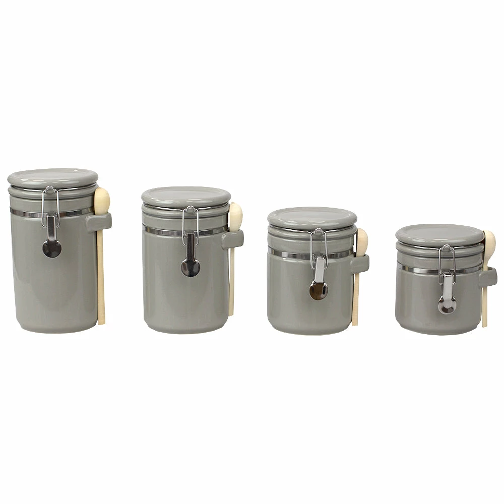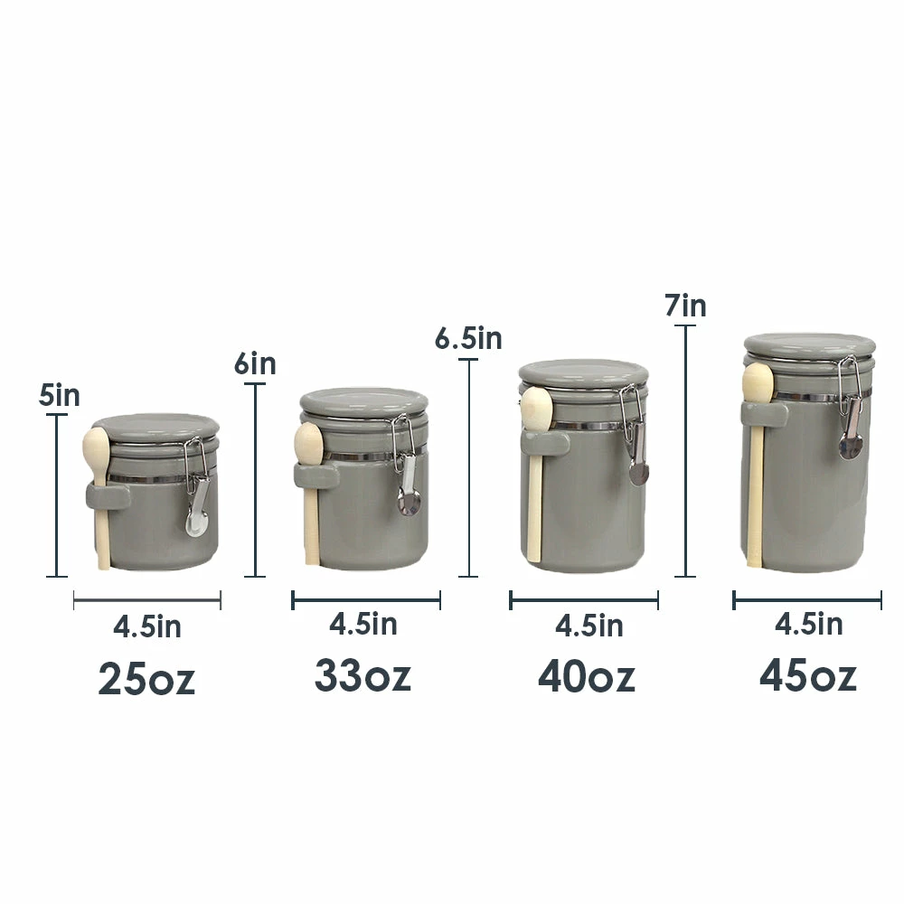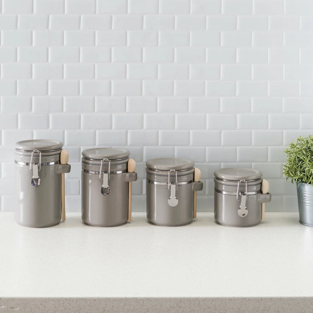If you want a set of canisters to perk up your countertops with a modern touch while keeping your dry foods neatly preserved and fresh.. look no further than this ceramic canister set. The set of four includes 25 oz, 33 oz, 40 oz, and 45oz containers with wooden spoons for easy scooping. Each canister is crafted of durable ceramic and features a vivid finish that lends a contemporary look to the kitchen. Use them to store coffee, flour, beans, and trail mix. Or they can hold candies, cookies, pretzels, and other yummy treats for easy access if you do not want to keep them in the pantry. These compact canisters are conveniently sized to fit on countertop, bar cart or island. Each canister is equipped with air-tight seals and sturdy steel latches that lock in all the contents inside. These items can also hold items outside of the kitchen such as rubber bands, nails and screws, craft supplies, and so much more for easy convenience. Hand wash to clean.