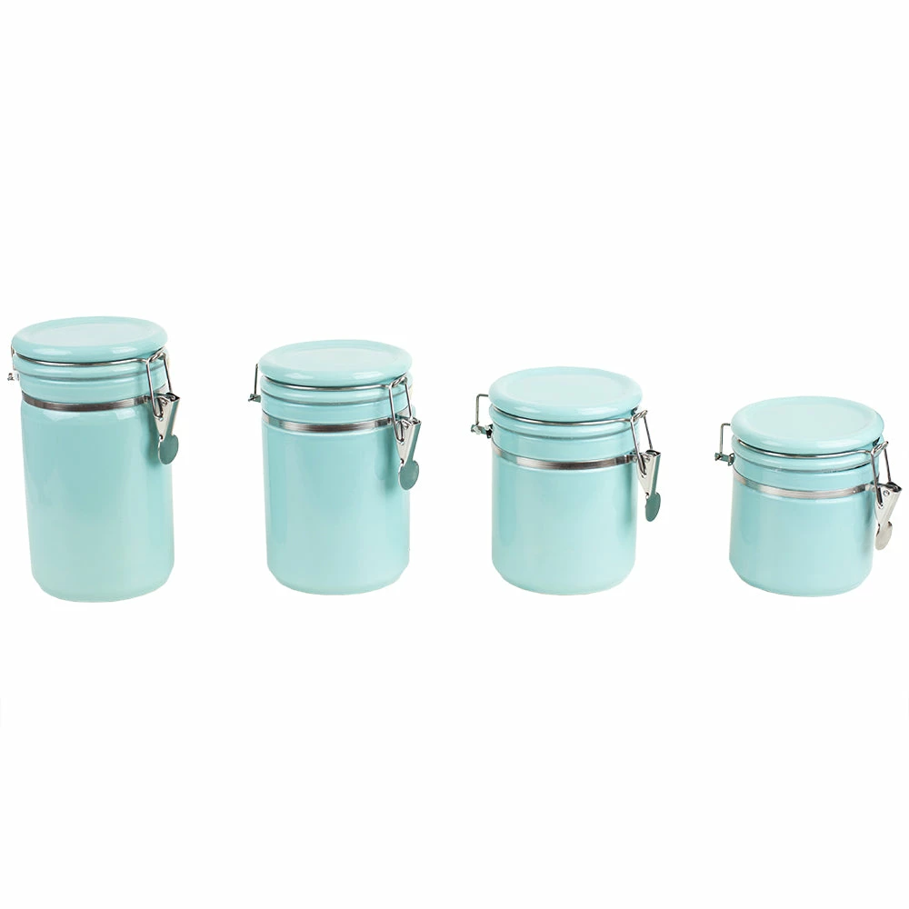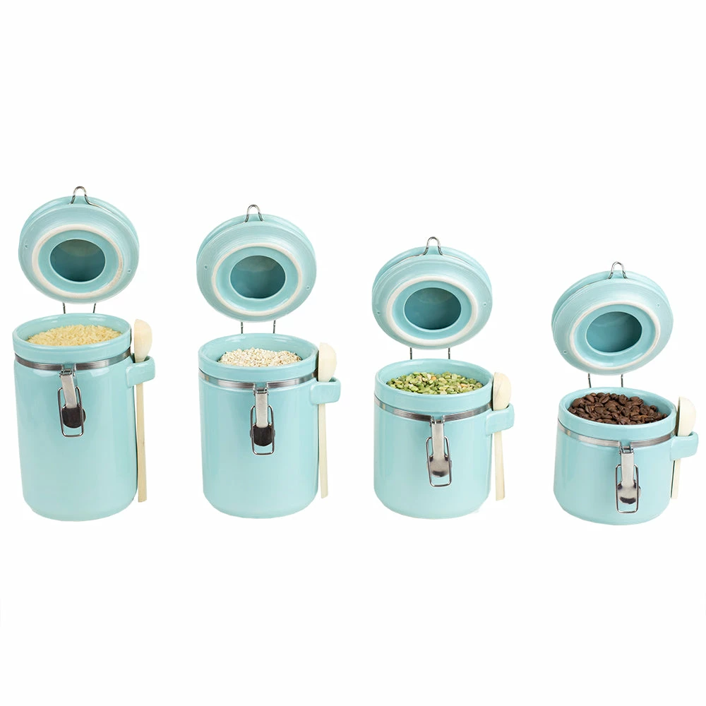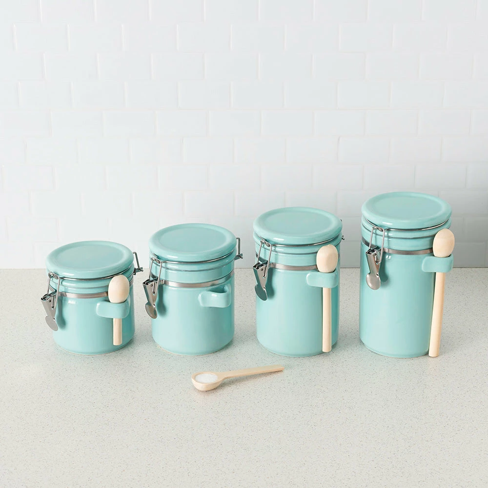 If you want a set of canisters to perk up your countertops with a modern touch while keeping your dry foods neatly preserved and fresh.. look no further than this ceramic canister set. The set of four includes 25 oz, 33 oz, 40 oz, and 45oz containers with wooden spoons for easy scooping. Each canister is crafted of durable ceramic and features a vivid finish that lends a contemporary look to the kitchen. Use it to store coffee, flour, beans, and trail mix. Or they can hold candies, cookies, pretzels, and other yummy treats for easy access if you do not want to keep them in the pantry. These compact canisters are conveniently sized to fit on countertop, bar cart or island. Each canister is equipped with air-tight seals and sturdy steel latches that lock in all the contents inside. These items can also hold items outside of the kitchen such as rubber bands, nails and screws, craft supplies, and so much more for easy convenience. Hand wash to clean.