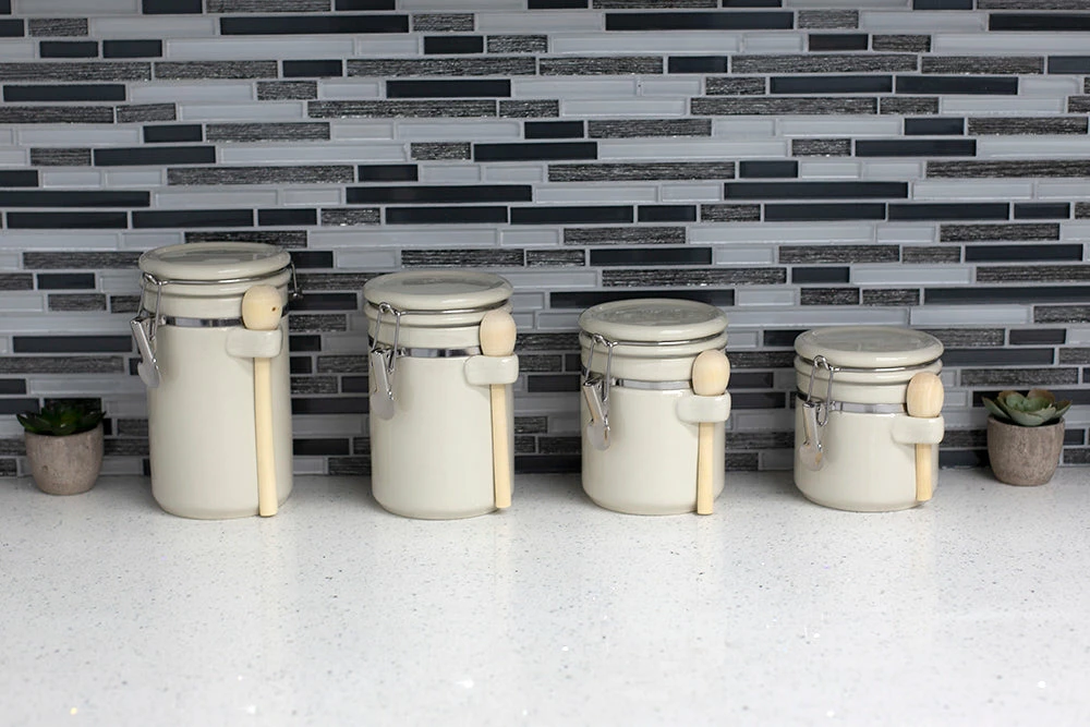 If you want a set of canisters to perk up your countertops with a modern touch while keeping your dry foods neatly preserved and fresh.. look no further than this ceramic canister set. The set of four includes 25oz, 33oz, 40oz, and 45oz containers with wooden spoons for easy scooping. Each canister is crafted of durable ceramic and features a vivid finish that lends a contemporary look to the kitchen. Use them to store coffee, flour, beans, and trail mix. Or they can hold candies, cookies, pretzels, and other yummy treats for easy access if you do not want to keep them in the pantry. These compact canisters are conveniently sized to fit on countertop, bar cart or island. Each canister is equipped with air-tight seals and sturdy steel latches that lock in all the contents inside. These items can also hold items outside of the kitchen such as rubber bands, nails and screws, craft supplies, and so much more for easy convenience. Hand wash to clean.