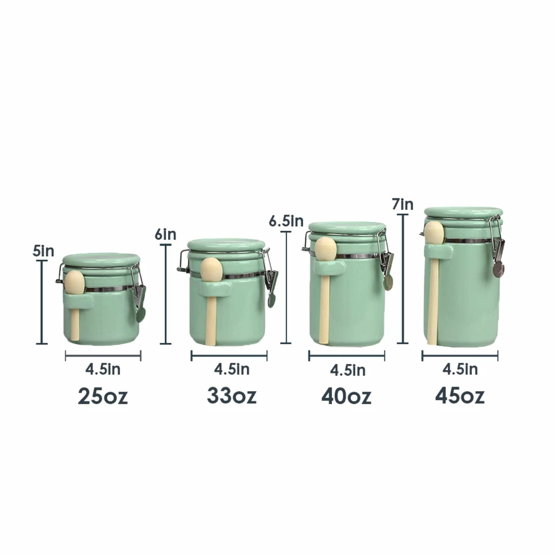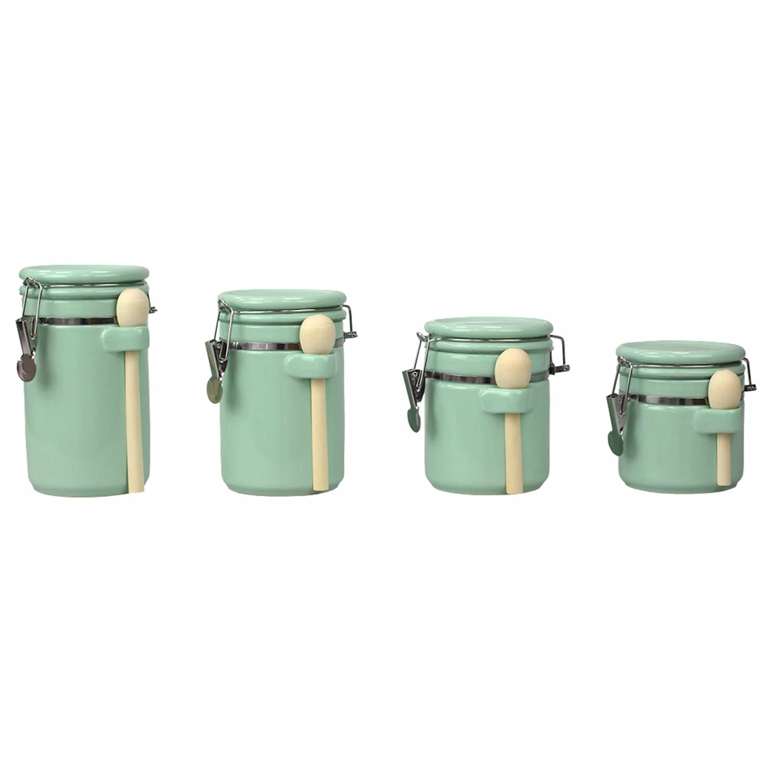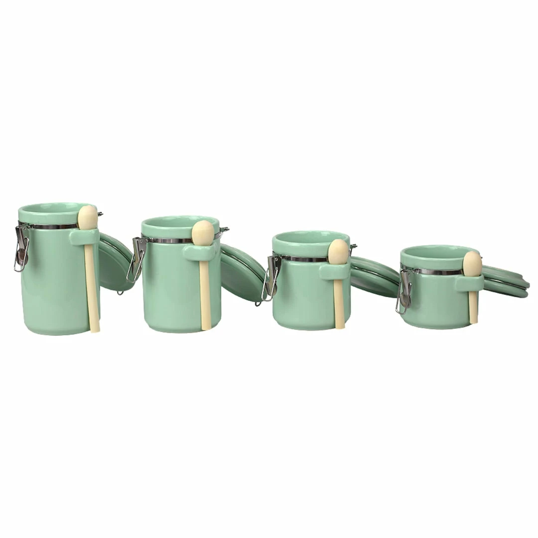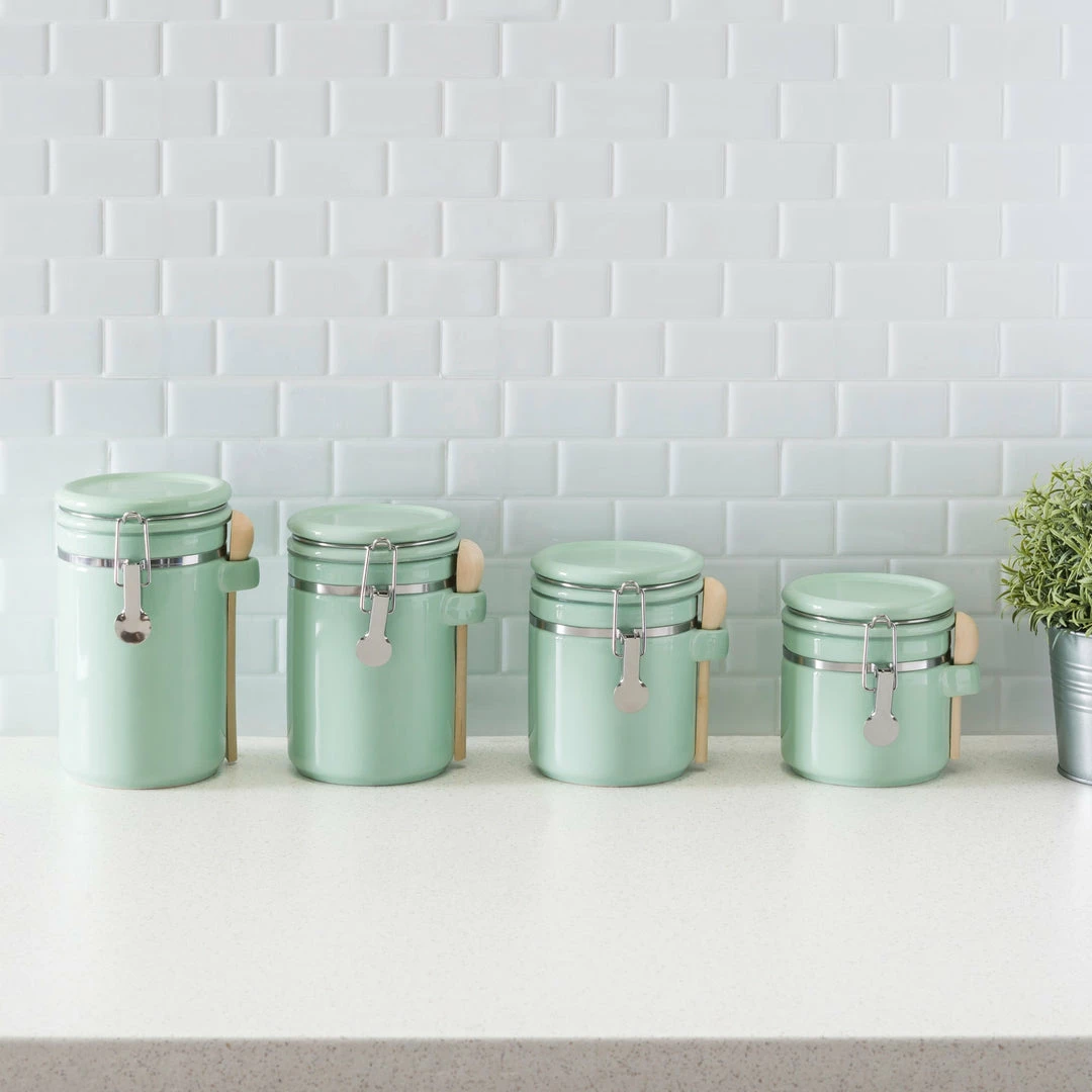 Be the first to review “Brand new ๐ Home Basics 4 Piece Ceramic Canisters with Easy Open Air-Tight Clamp Top Lid and Wooden Spoons, Mint ๐ฅ” Cancel reply