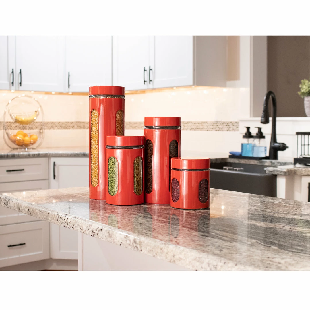 Store candy, sugar, trail mix and more with this Home Canister Set. Made of heavy duty steel, it features a clear window along the center of the base to allow you easily see the contents of each canister.