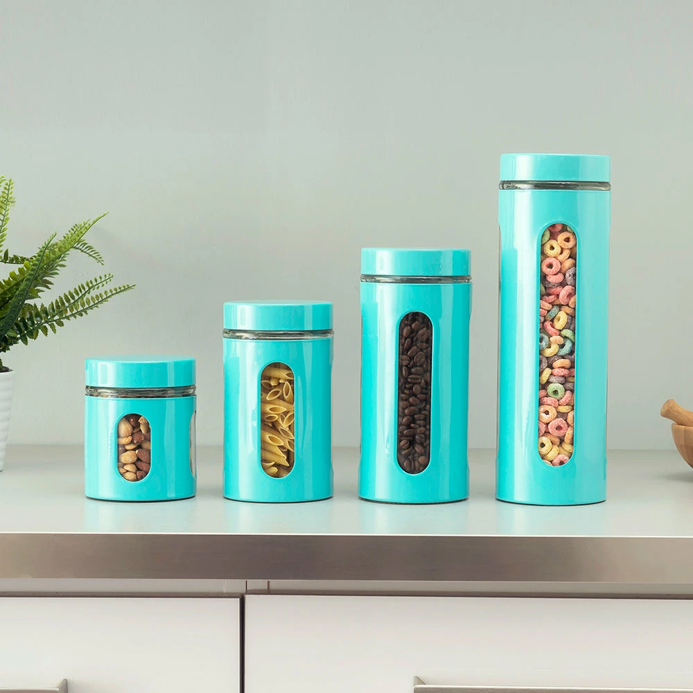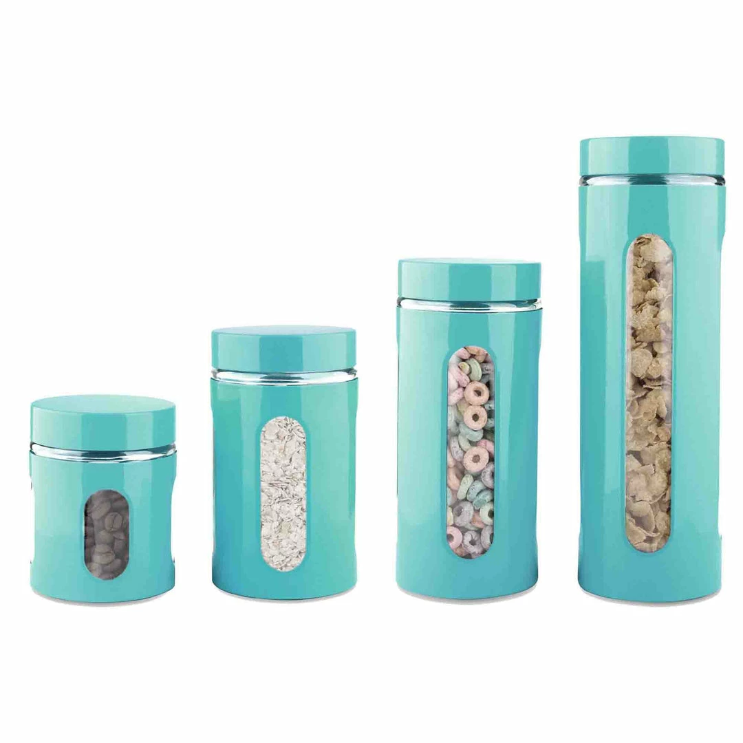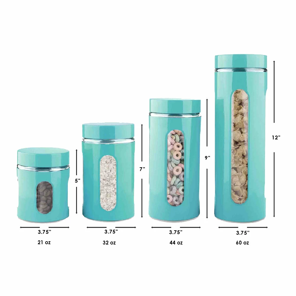 Store all the goodies such as candy, sugar, trail mix and more with this 4 piece canister set. This set can also hold other dry ingredients such as flour, rice, sugar, and coffee beans. Made of heavy duty steel, it features a clear window along the center of the base to allow you easily see the contents of each canister. Each one is also equipped with twist off lids that keep your contents secure. The vibrant finish adds a splash of color to your kitchen and provides a fun way to neatly organize your food. Place these anywhere from the kitchen countertop, or they can be kept more discreetly in a pantry or cabinet. Use these outside of the kitchen as well, as they can hold pens, clips, pins, hair accessories, and even jewelry. Props and accessories are not included.