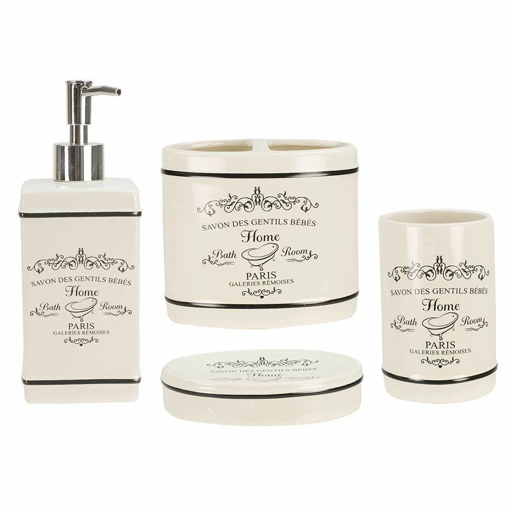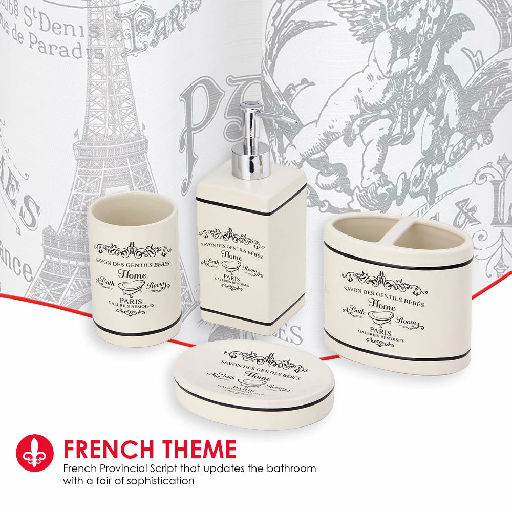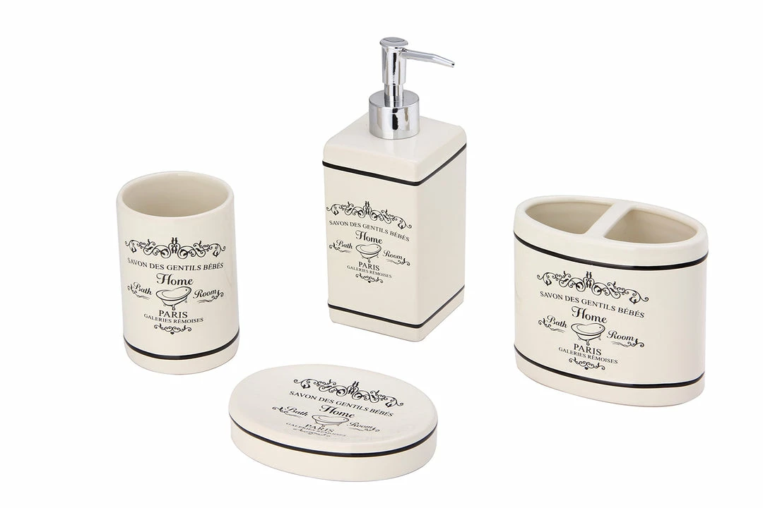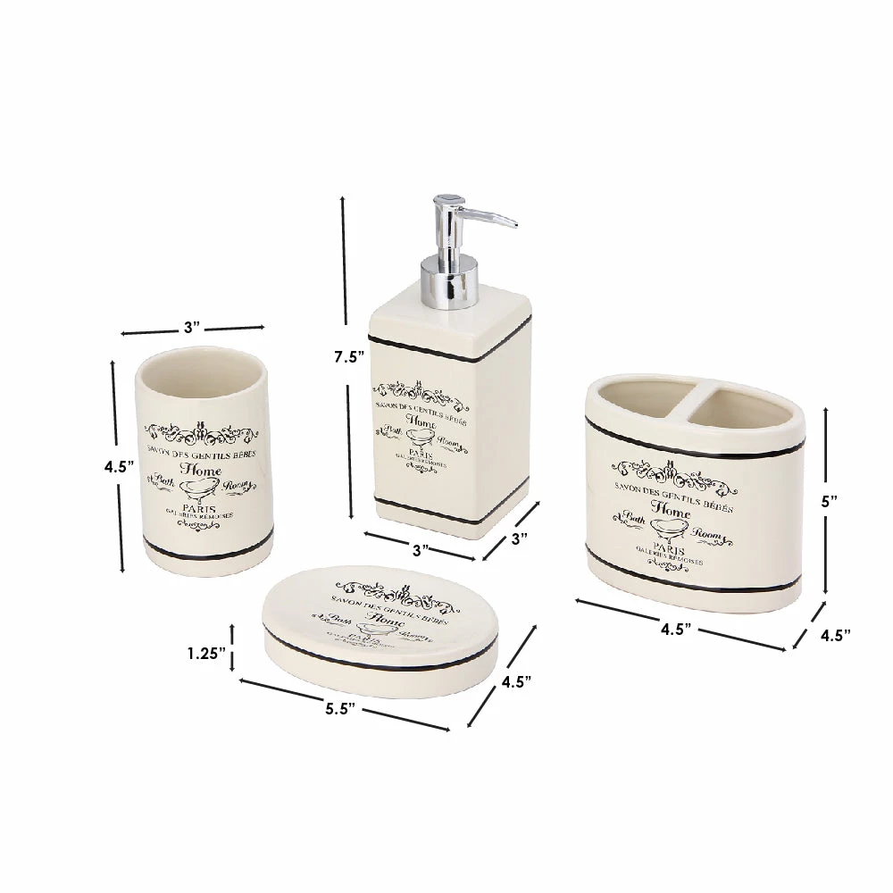 Grace your bathroom vanities with a Parisian flair using this 4 piece ceramic bath set. The set comes complete with a soap dispenser, toothbrush holder, tumbler, and a soap dish. Each item features elegant script with spiral detailing atop a delicate white hue. There are also beveled black accents that encompass each piece for added interest. The set neatly fits together on the sink counter and aids to avoid unnecessary clutter. Use the set not only for the bathroom, as the dispenser can also pump out sanitizer, and the tumbler and toothbrush holder can also hold stationary pens and brushes. The soap dish is also great for holding small jewelry while you bathe as well. Keep the set to yourself, or give as a housewarming gift to spruce up a new bathroom. Hand wash to clean.