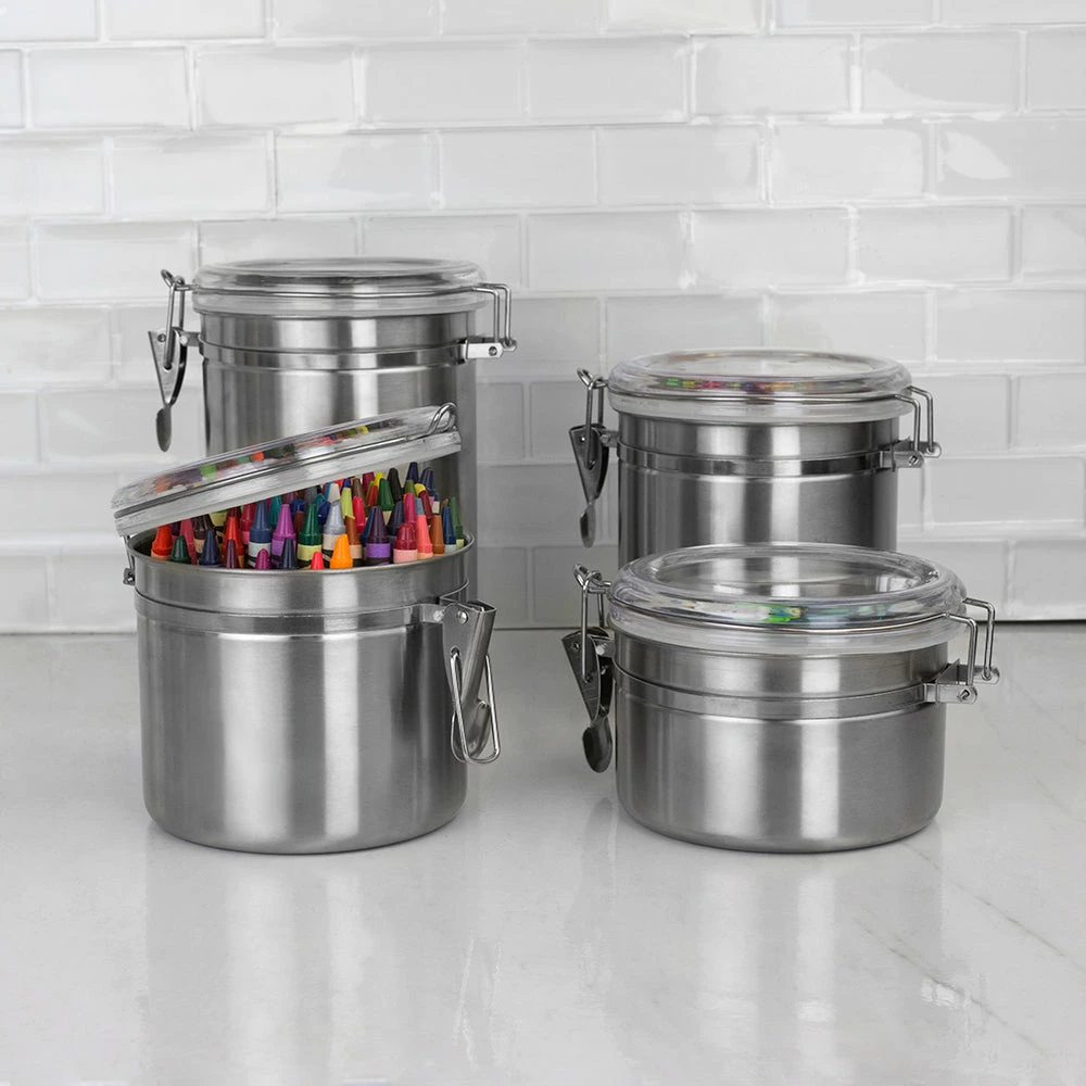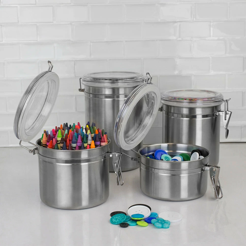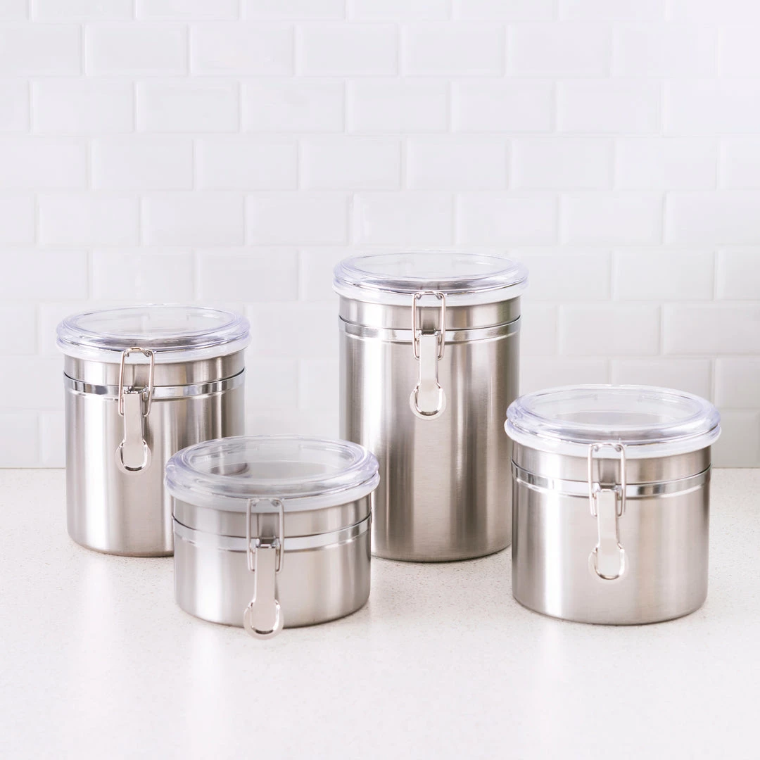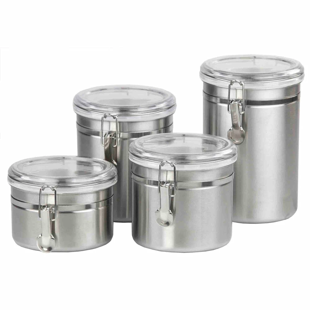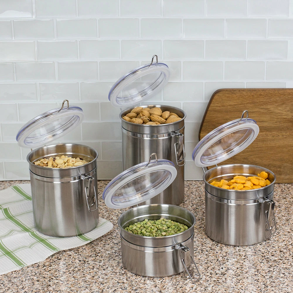 4-Piece canister set provides storage space for various foods. Made from durable stainless steel construction with a clear top flip-lid. Airtight design keeps ingredients fresh; includes four assorted sizes. Looks great in any kitchen setting.