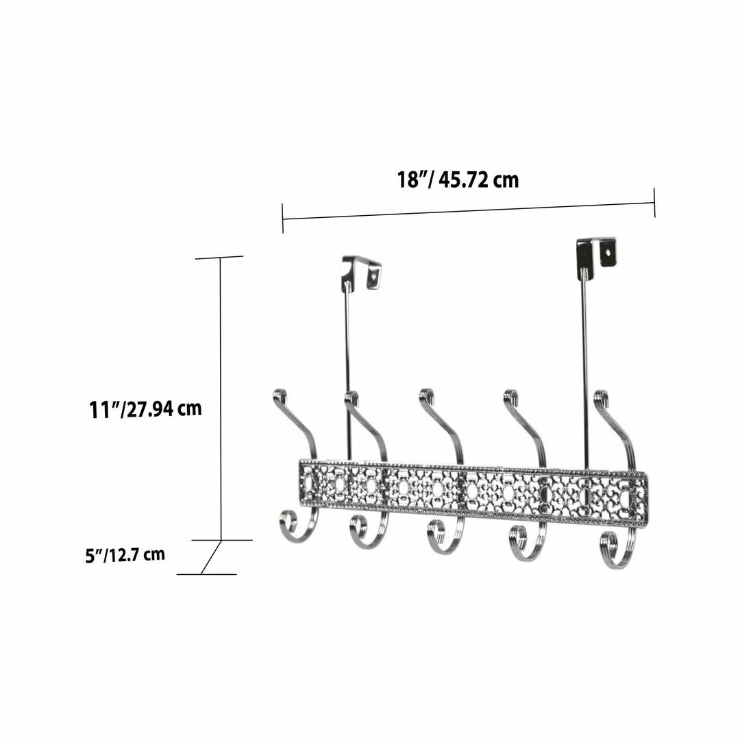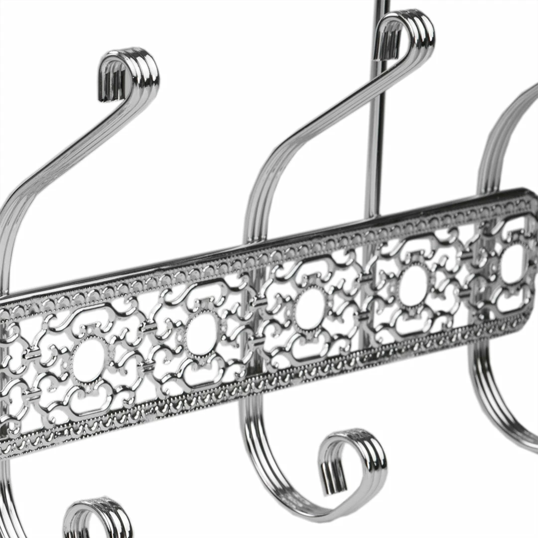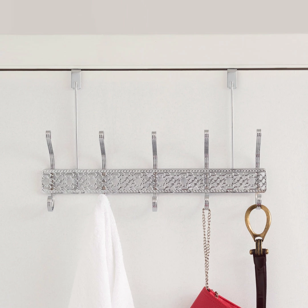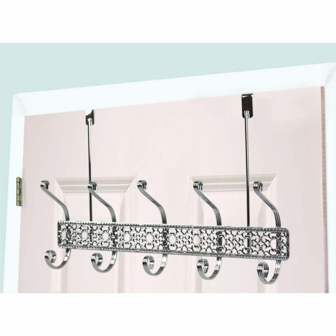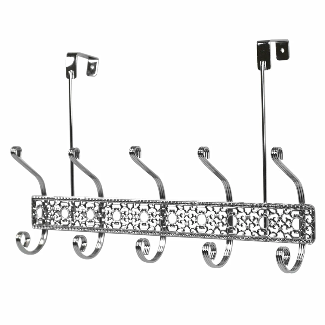 A great way to add instant storage without drilling holes, this over the door hanging rack is perfect for bathrooms, bedrooms, kitchens or whereever storage is limited, while adding a touch of elegance with its ornate frame and gleaming chrome finish. Simply clip it over the interior door and youโre set to go. The 5 dual hooks are perfectly spaced to corral your soft, fluffy robes while you dry off after the shower. Beyond the bathroom, this versatile rack is great to keep in the foyer stash your guestโs winter coats, or even the kitchen to hang your frequently used cooking tools and gadgets.