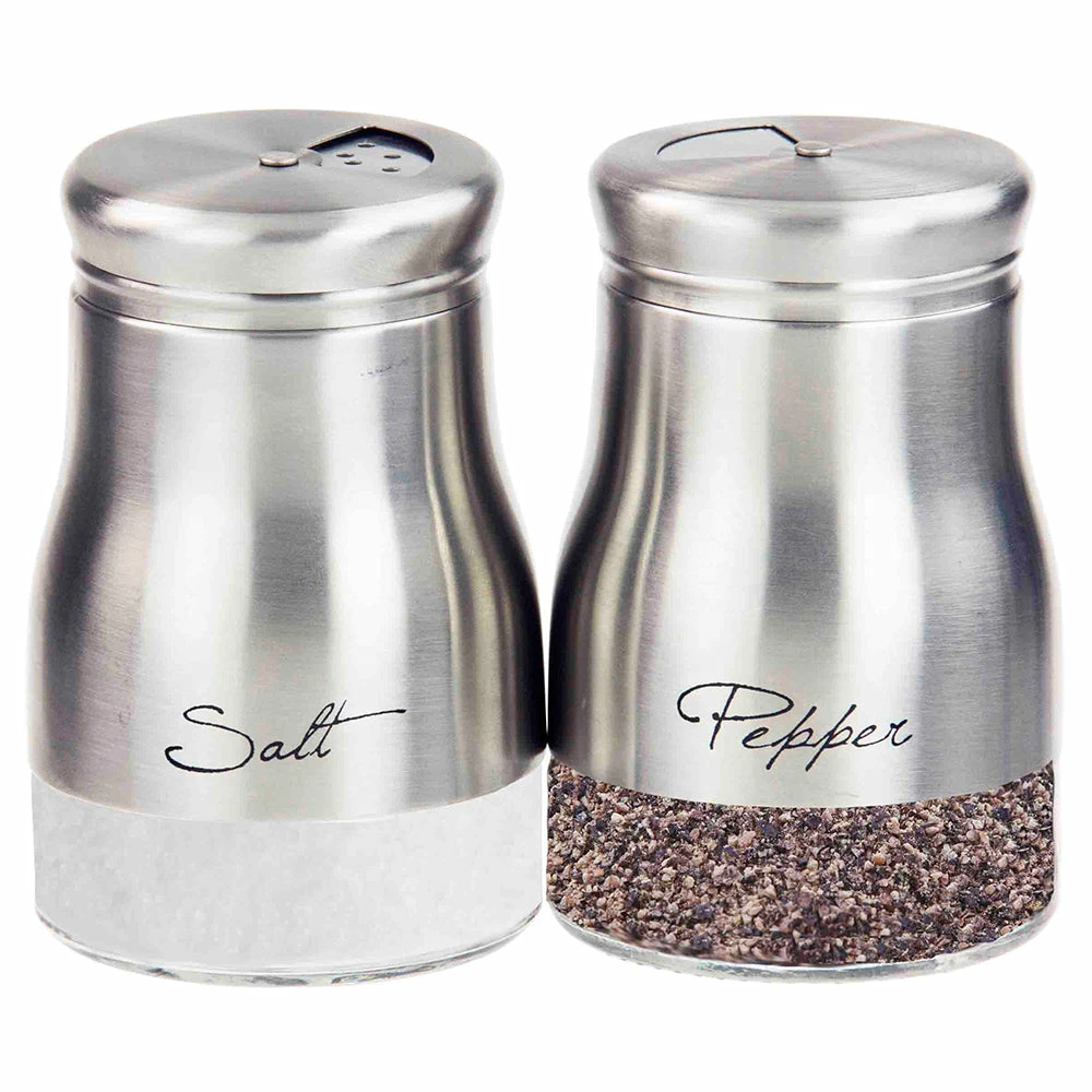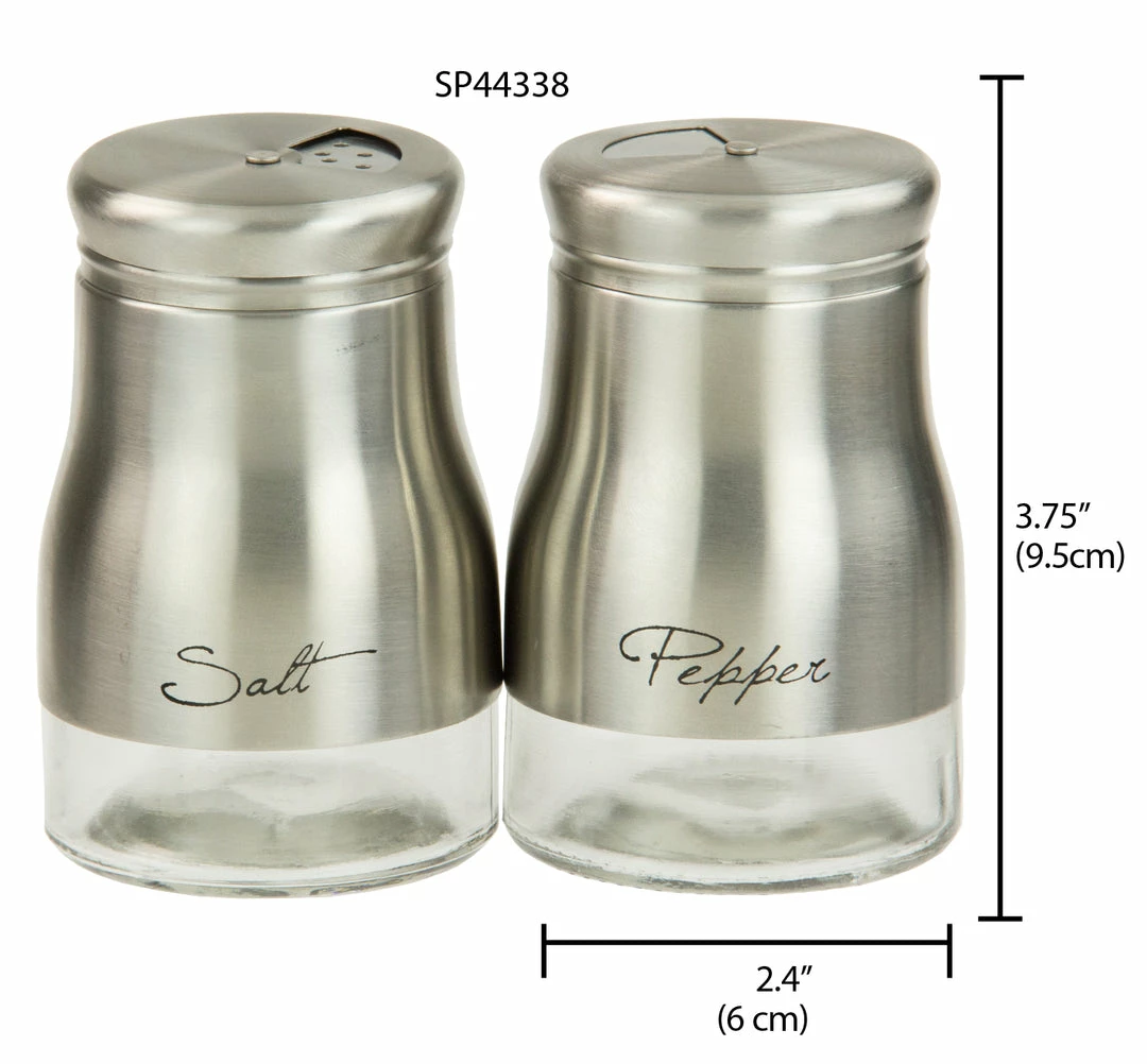 Bring your contemporary table setting together with this elegant styled stainless steel salt and pepper shakers. Each shaker holds 5 oz. and measures 4 inches in height with elegant scripted labels for easy identification. The air-tight cap twists to conceals perforations to keep food fresh for dispensing, while the transparent glass bottom makes it easy to monitor the level of condiments within. These salt and pepper shakers are a perfect addition to the kitchen, perfectly complementing existing stainless steel and modern styled appliances.