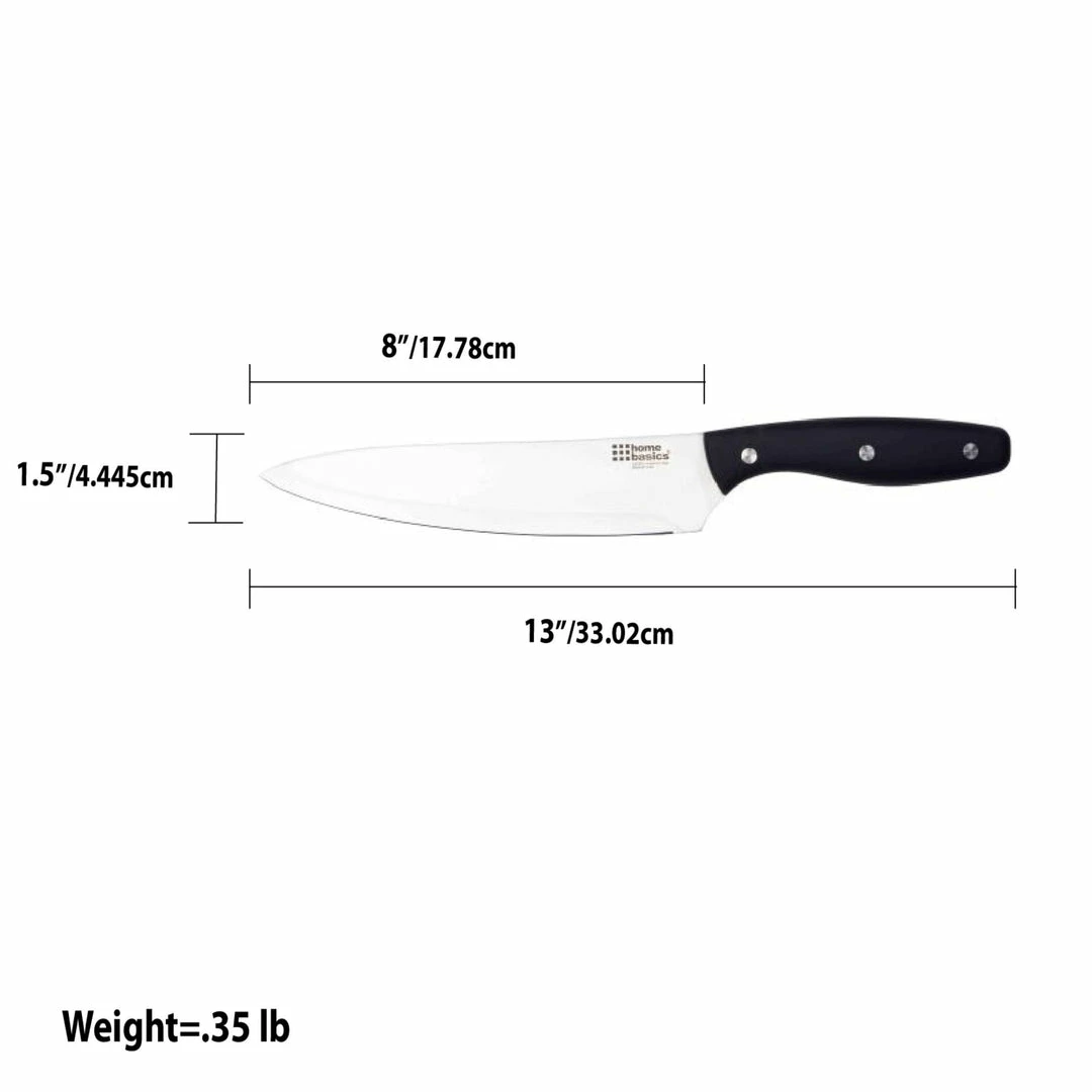Cut and prepare food with ease using this Home Basics Stainless Steel Knife. The razor sharp full tang riveted blade makes it great for slicing, dicing, chopping a wide range of ingredients. Slip-resistant and ultra soft handles provide a comfortable grip, making it a pleasure to use for all your culinary preparation needs.
