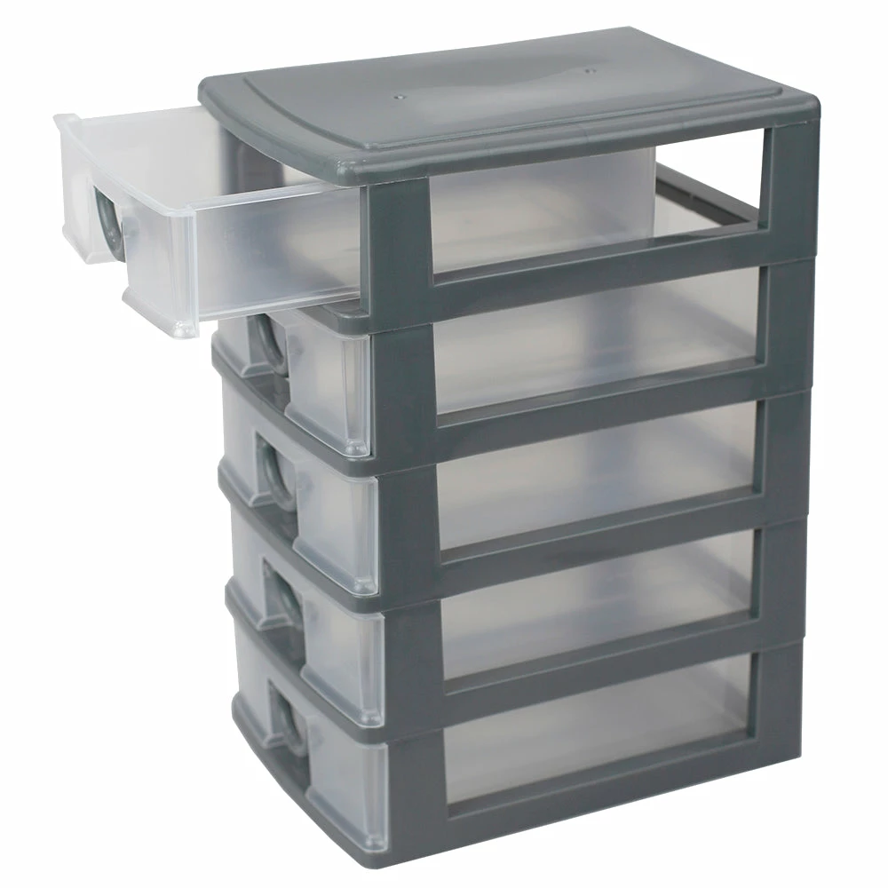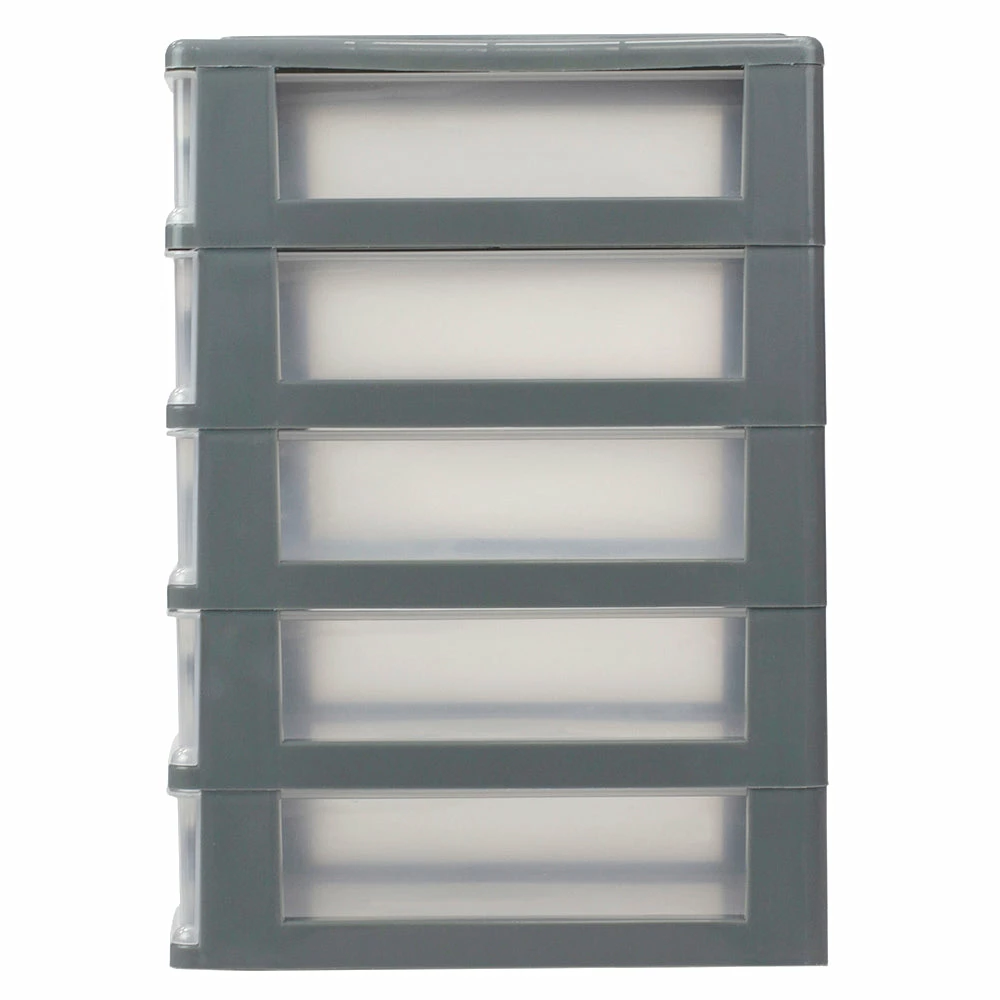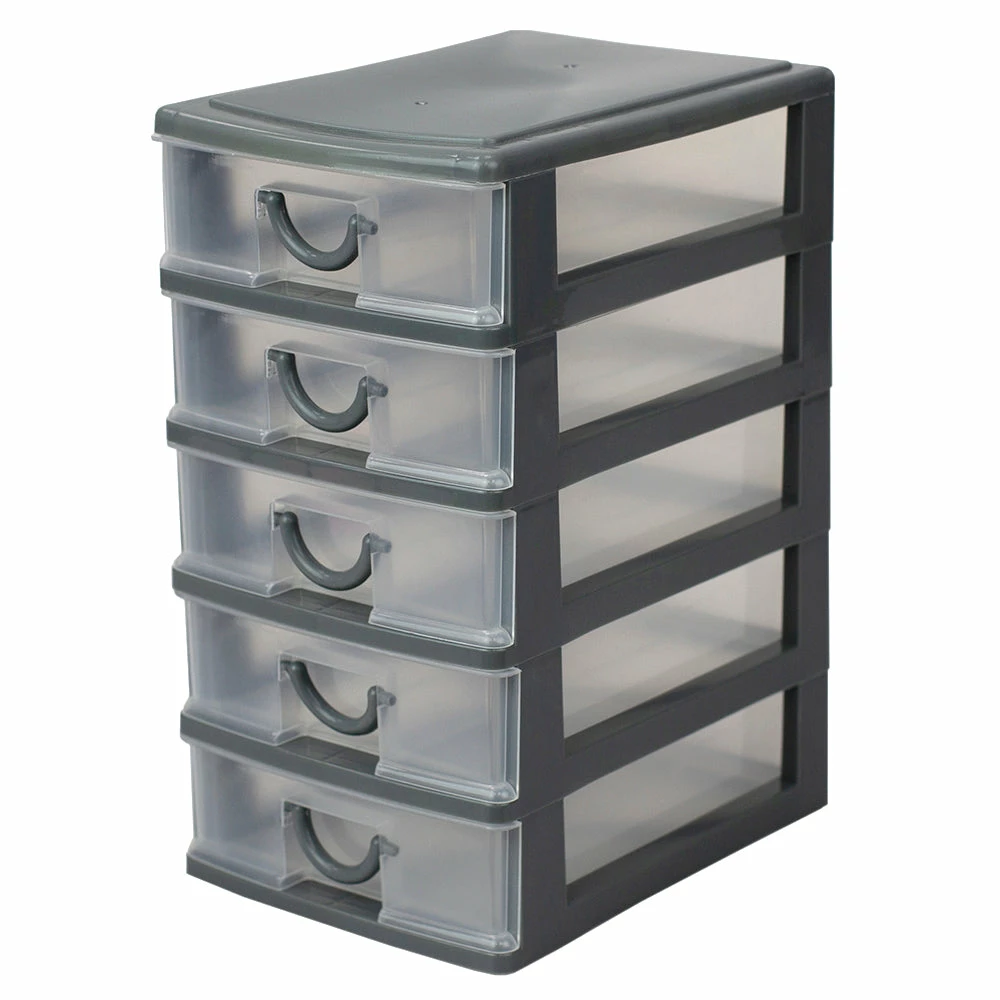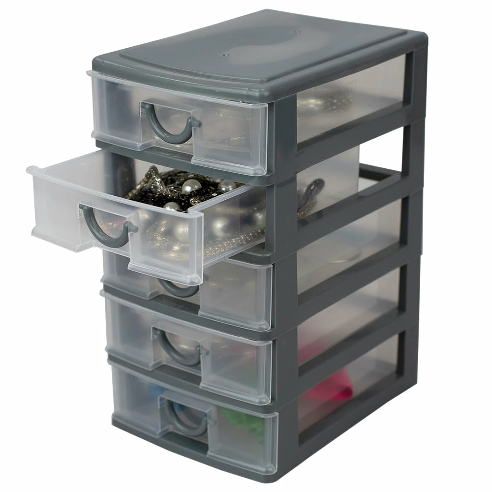 Clear the clutter off counters and your vanity with this handy 5 drawer small jewelry organizer. The organizer features transparent walls, allowing you to see what is inside each drawer from any angle. The 5 tier design is perfect for stashing bracelets, lips sticks, small brushes, and other small makeup and accessories. Slide each drawer out smoothly with its easy grip handles. This compact and versatile organizer box is perfect for storing office supplies, as well as small craft supplies.