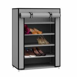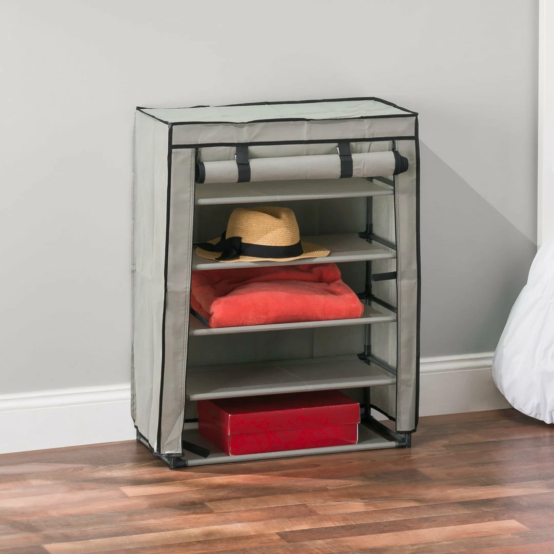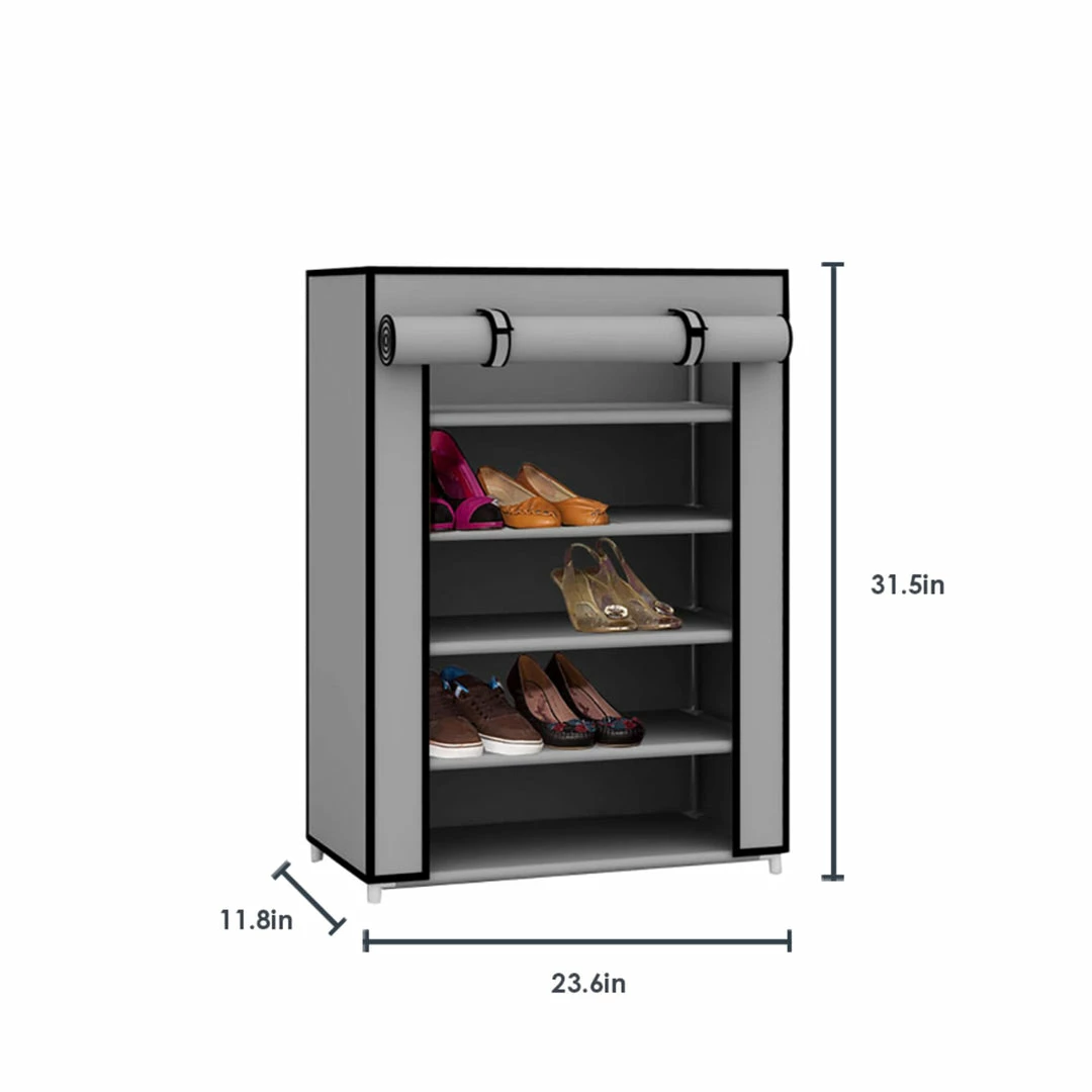 A perfect solution for your shoe storage dilemma, this 5 tier shoe storage tower can be placed in a busy entryway to keeps shoes readily accessible or ina cubby closet to keep folded linen, bath towels and shirts neatly stored. The unit holds up to 12 pairs of shoes. It is constructed of thickened metal pipes with sturdy plastic connectors with removable tiers to fit taller items. Roll the fabric cover down to keep dust and debris from entering or roll it back up to keep it in place view. It snaps together for hassle-free set up within minutes and requires no tools to install.