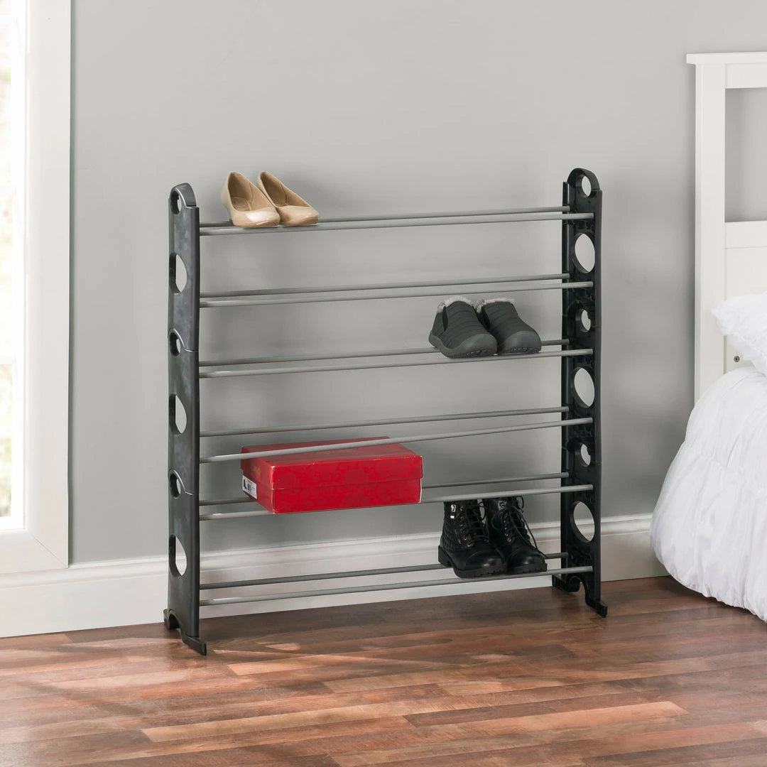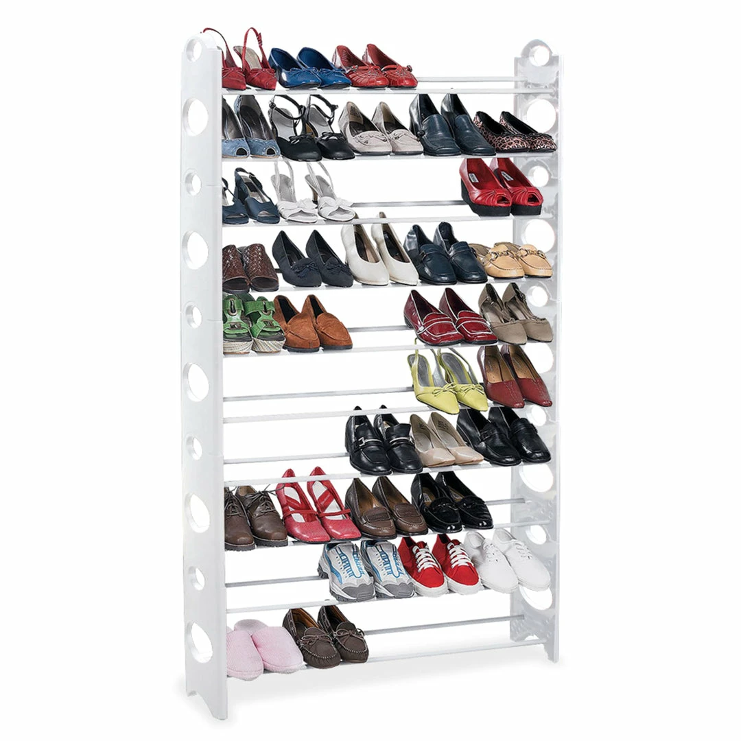 Designed with high strength metal rods and sturdy plastic attachments this tiered free standing shoe rack can accommodate up to 50 pairs of shoes. Varying size holes on each side allow to adjust the distance between shelf to accommodate different types and sizes of shoes. The open style shelving allows you to see your collection in a quick glance, while also keeping your shoes well-ventilated. Step, by instructions included for quick set up right out of the box. Spot clean.