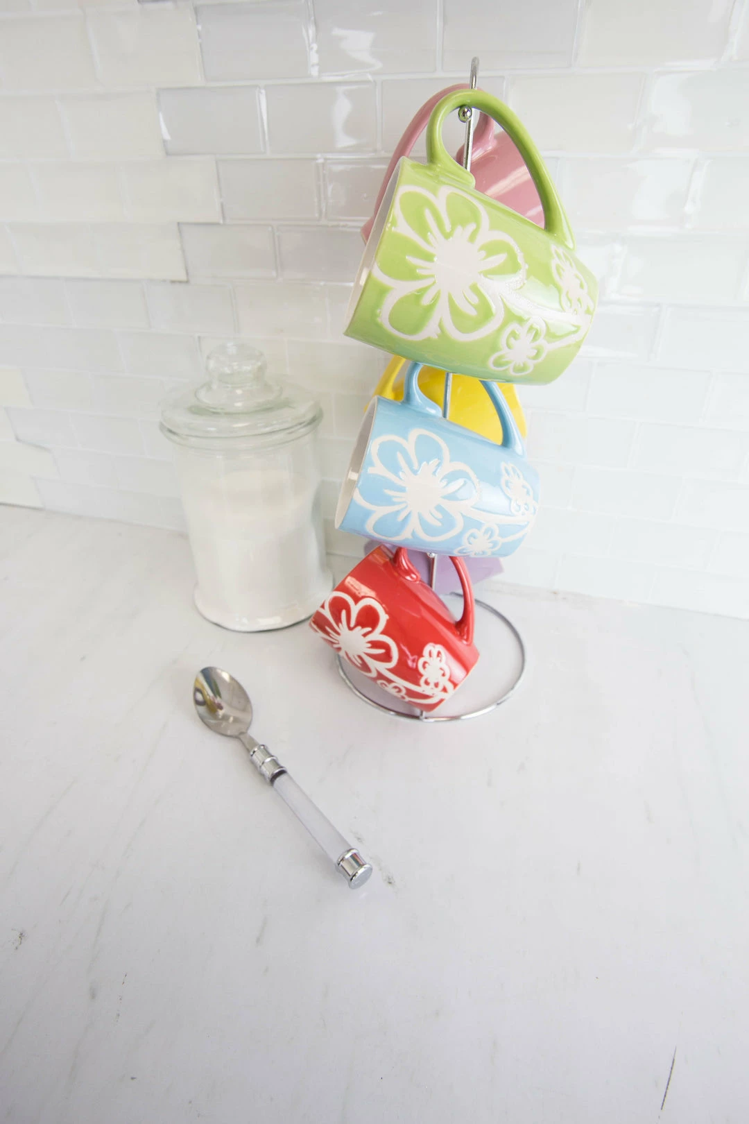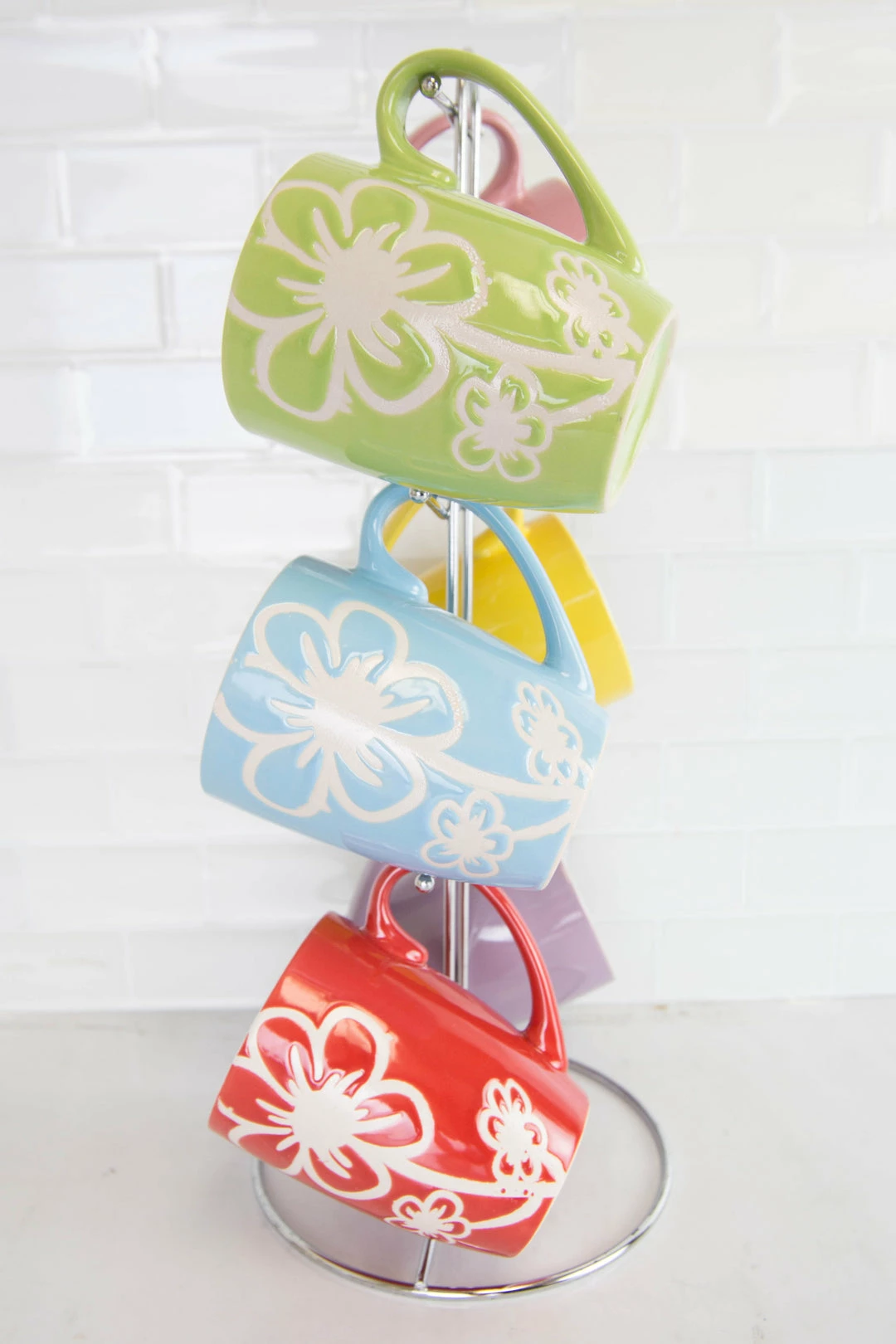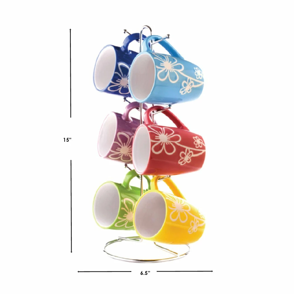 Engraved with elegant white daisies atop soft, colorful hues, this adorable ceramic mug set is sure to brighten up any kitchen with its playful design. It comes complete with sleek chrome plated steel stand with angled branches to provide an all-around view of each glazefinished mug. The ends are rounded to ensure cups remain in place for all to admire. From a piping-hot cup of cocoa to ice-cold lemonade, these floral mugs make each sip of your favorite beverages extra exhilarting.