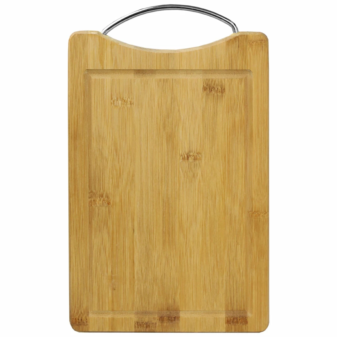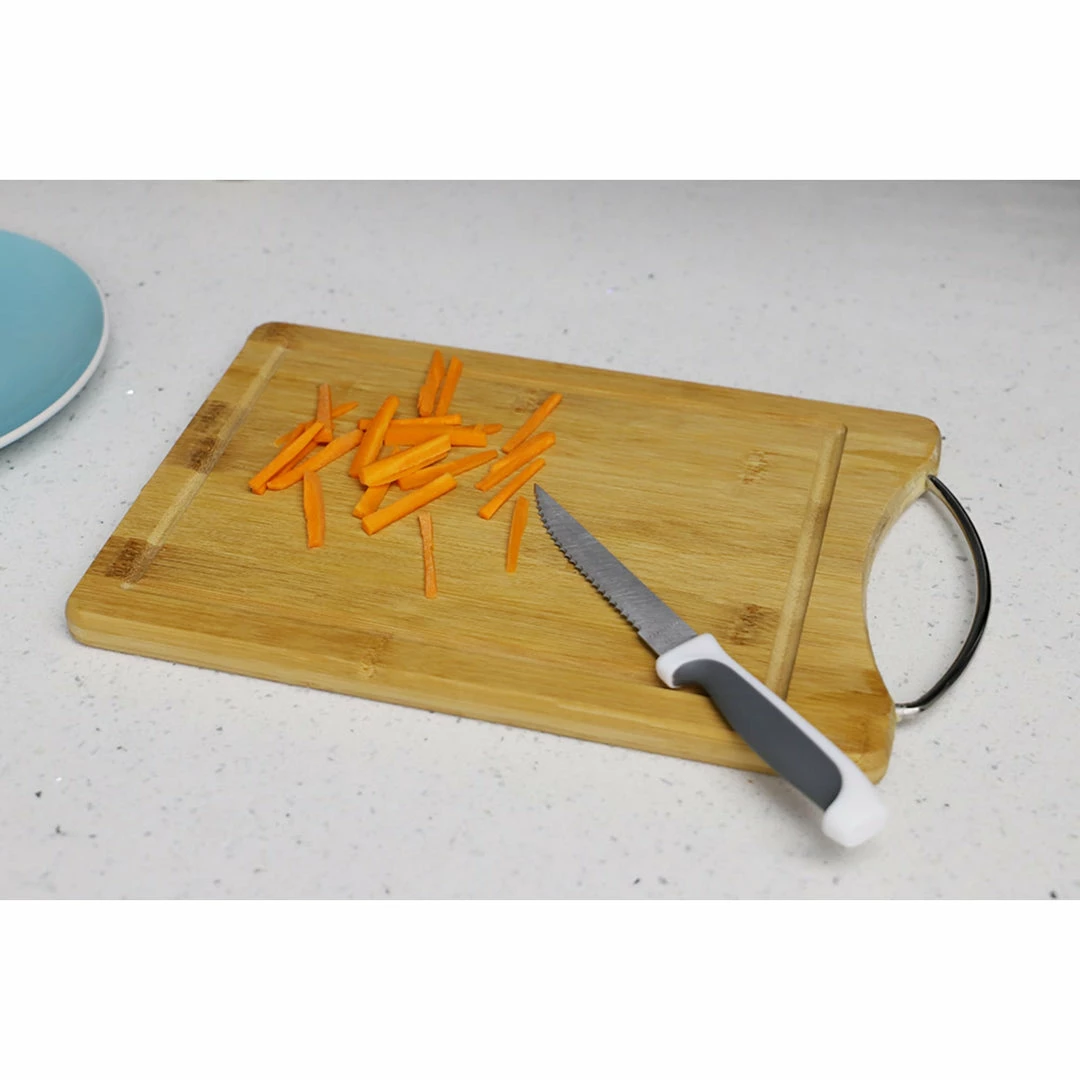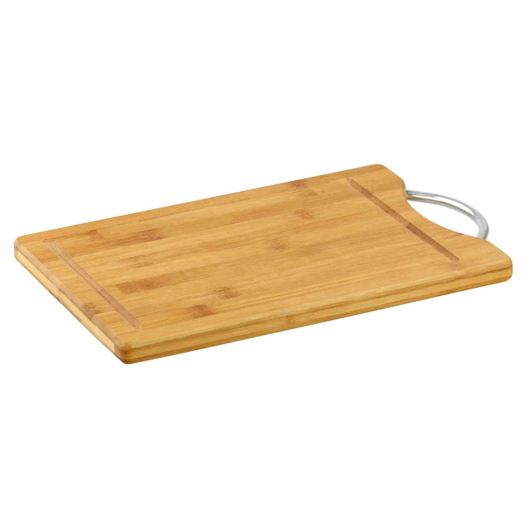 - STAINLESS STEEL HANDLE – For a firm hold while carrying, the bamboo cutting board comes equipped with a stainless steel handle that doubles as a hook to hang on a rack when not in use.