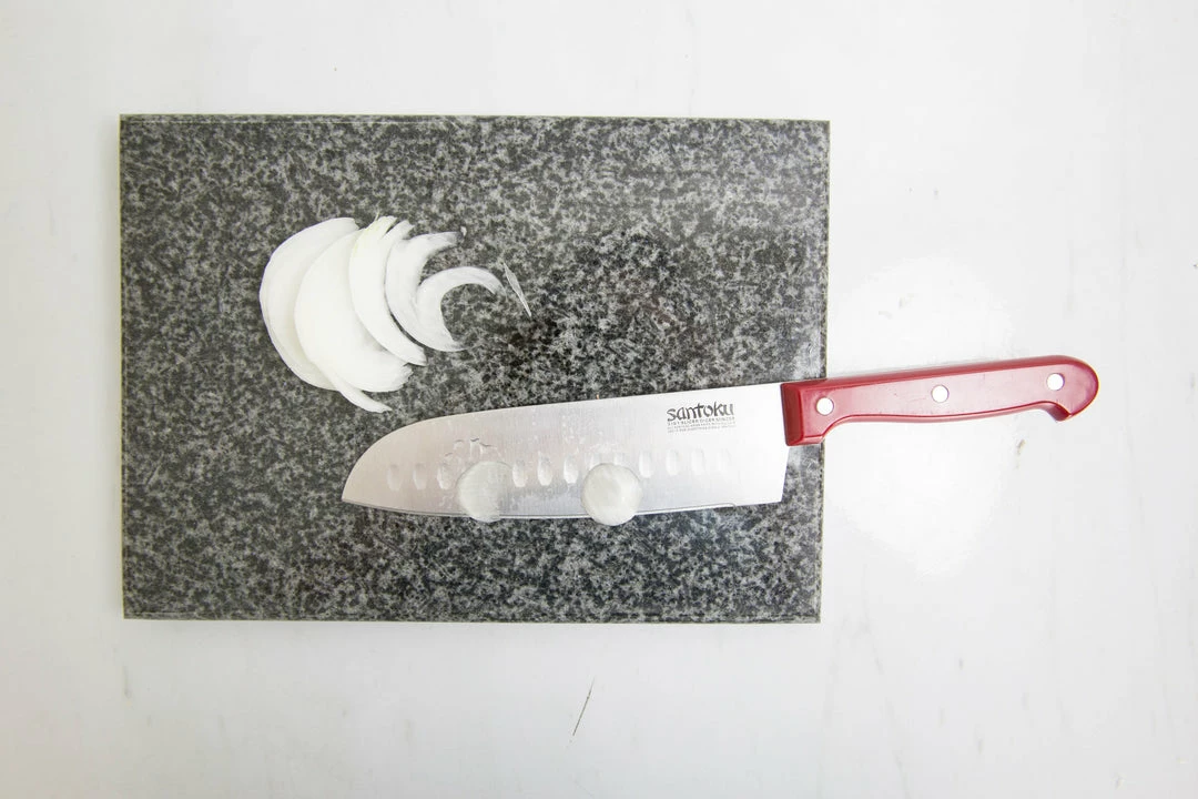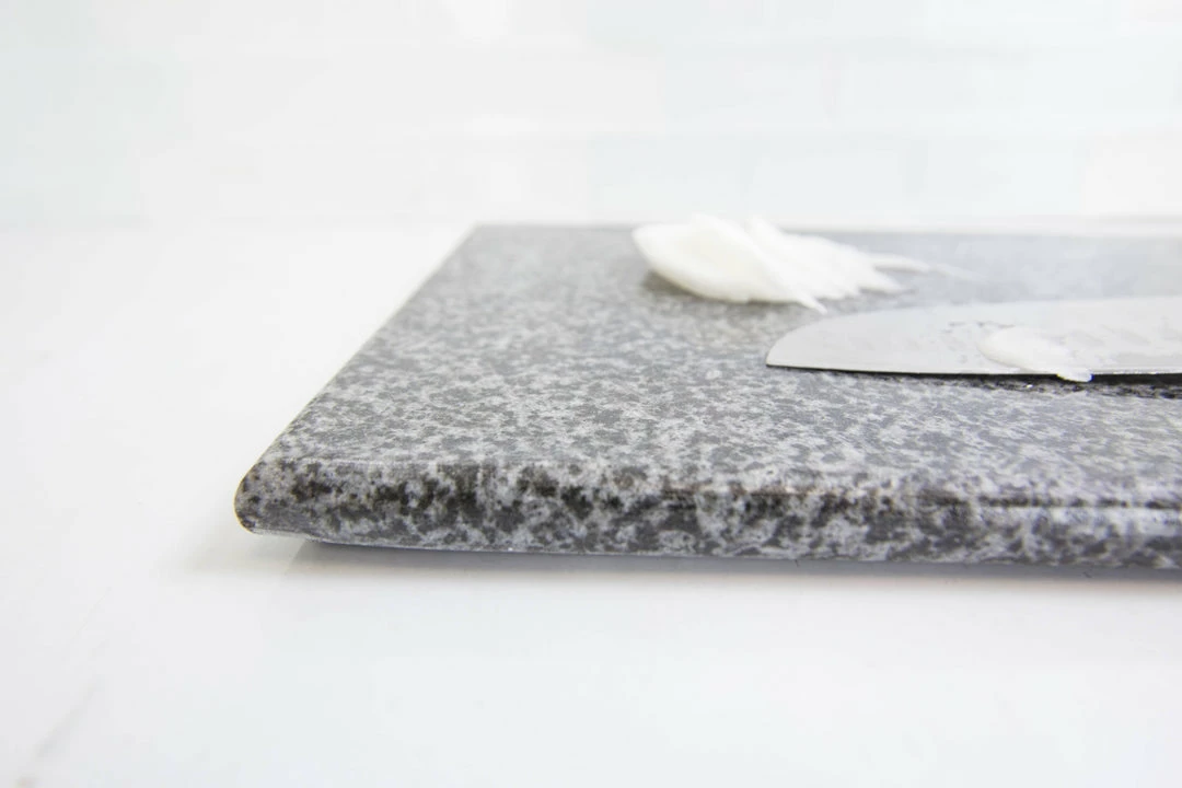 Reminiscent of a polished gem, this granite cutting board brings class and sophistication to food preparation. Soft white hues and a smoothe finish add an elegant flair to a wide range of kitchen counter and tabletops. The heavy duty design provides a durable surface to slice, chop and prep fruit and vegetables. Rounded bottoms prevent the piece from shifting, providing a stable platform to prep ingredients.