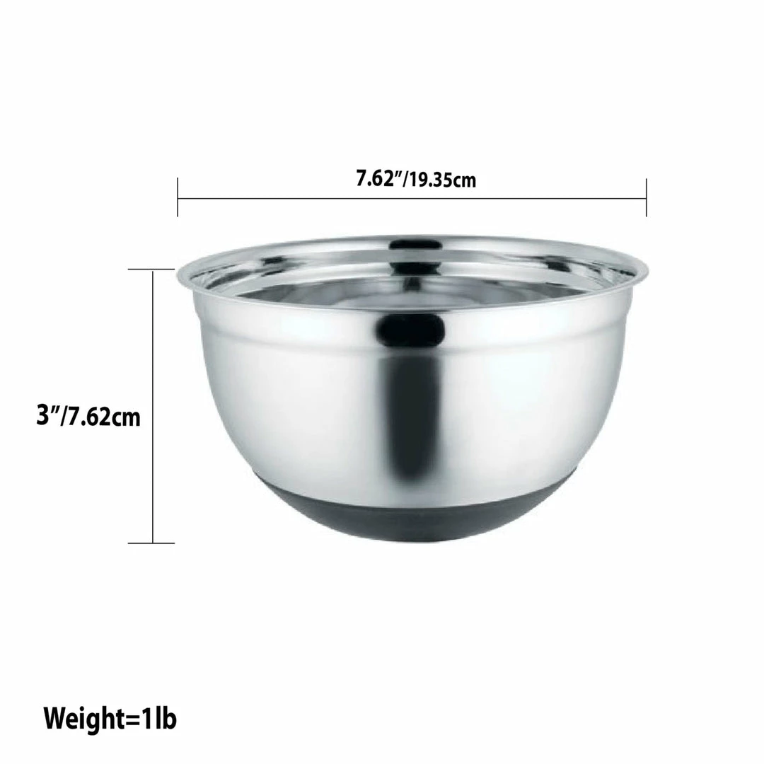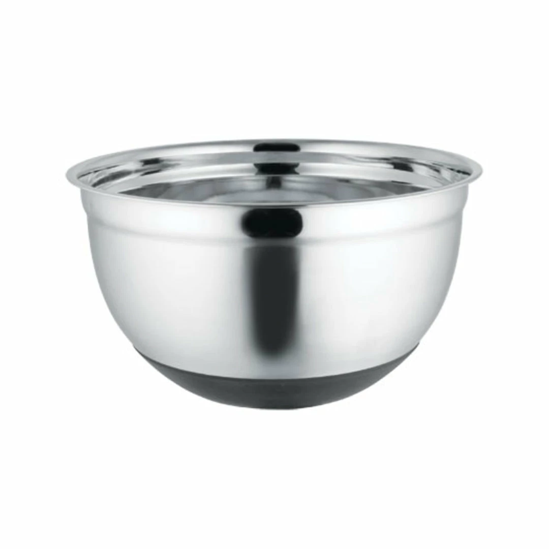 Mix, whisk, and prep with this dual tone polished steel anti-skid bowl.The high walls and deep shape make it great for keeping your mixture neatly contained in the bowl. And the rubberized base keeps your work surface free from scratches, while in use. Great for mixing up a heavy cake batter to serving fresh salad.