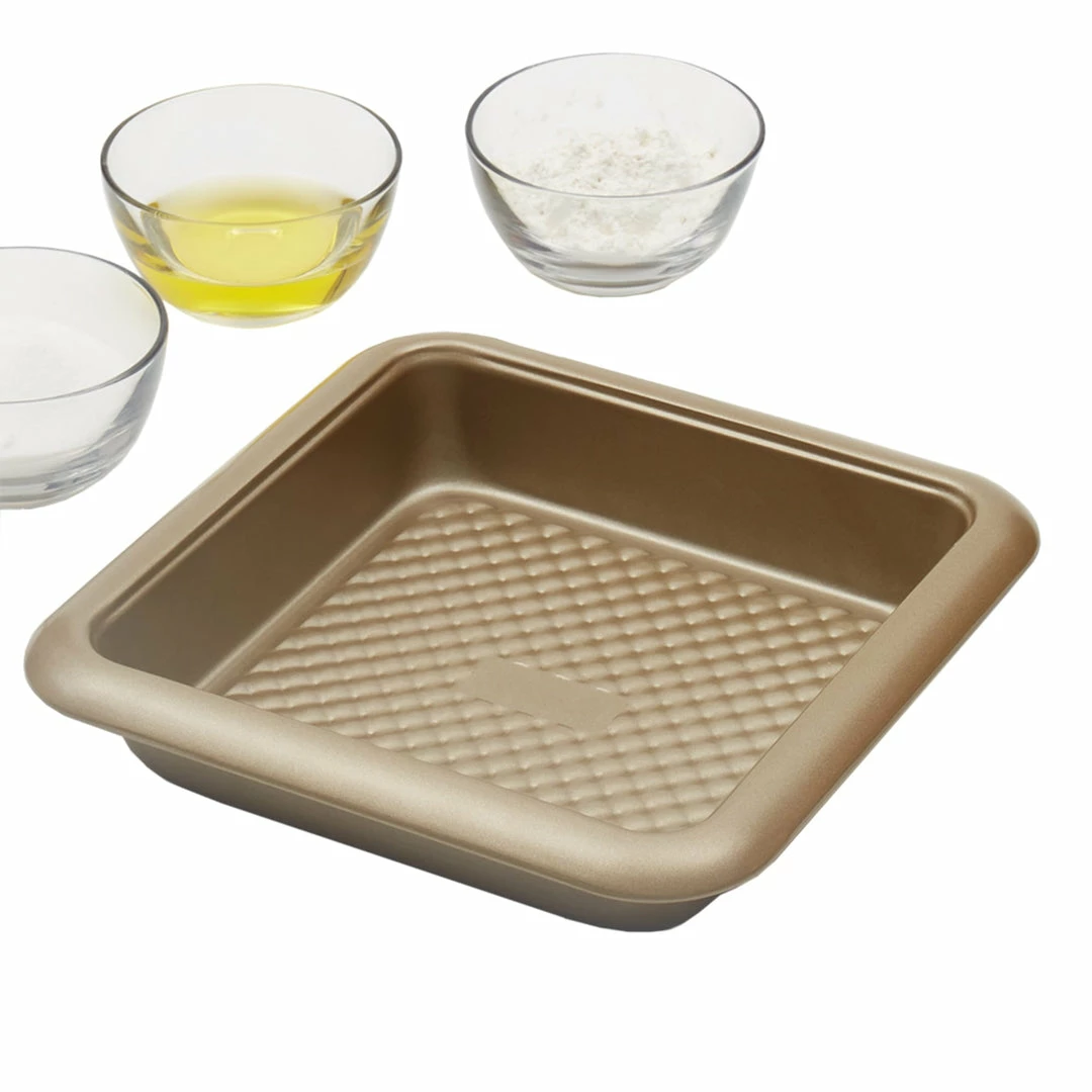 Bake beyond perfectly symmetrical square shaped cakes and brownies. This versatile and multi-purpose pan is also great for whipping up roasting vegetables and savory lasagna during busy weeknights or crowd-pleasing cornbread during the holidays. The distinct, textured surface maximizes air flow and facilitates even heat distribution yielding beautiful consistent results every time. The premium steel brings together the convenience of non-stick so you can bake up a variety of specialty desserts without worrying about food breaking or sticking to pan after release. Gift multiple to give to friends and family or use more than one to build a stunning multi-tiered layered cake. Oven safe up to 220 degrees Celsius/428 degrees Fahrenheit. PFOA, PFTE, and BPA Free. Dishwasher safe. Item dimensions may differ slightly due to the unique nature of the product. Color and finish may also differ from the images shown due to differences in monitor displays. Props and accessories are not included