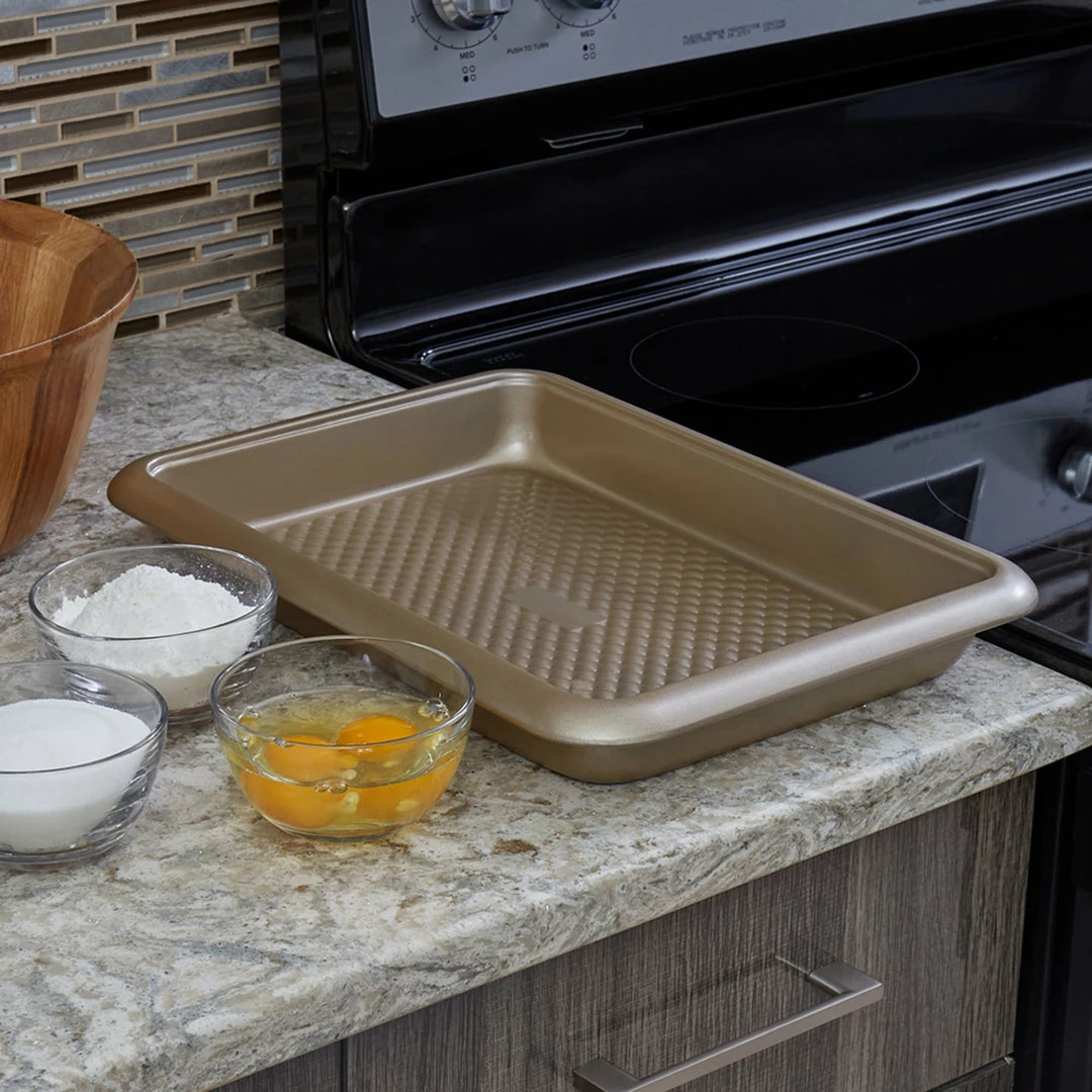For an easy way to whip up smaller week night meals and where storage space is limited, this shallowing roasting pan with a texturized inner bottom is a kitchen essential you’ll be glad to have on hand. It features a superior non-stick surface which eliminates the need to douse the pan with a heavy coating of grease with a texture interior to keep air circulating for a smooth and rapid release. The pan is roomy and shallow enough to cook up a small mouthwatering roast or cook up a melt-in-your-mouth casserole. Its rectangular shape provides versatility allowing you to cook more than one item. Oven safe up to 220 degrees Celsius/428 degrees Fahrenheit. PFOA, PFTE, and BPA Free. Dishwasher safe. Item dimensions may differ slightly due to the unique nature of the product. Color and finish may also differ from the images shown due to differences in monitor displays. Props and accessories are not included.
