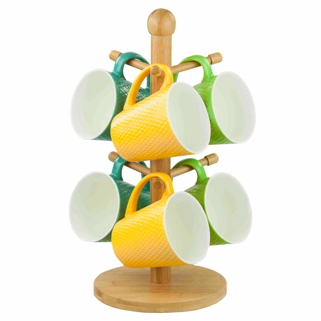 Save your cupboard for other kitchen tools, by placing your valuable mugs on this bamboo mug tree. It holds up to six mugs, with a hanging design that allows you to easily access them. There are capped ends on each branch, so that the mugs will stay securely in place. The tree has an overall compact profile, and it won’t take up a lot of room on your counter, cabinet, or table. Use this not only for your mugs, but it can also hang a variety of necklaces and bracelets, and it can hold holiday ornaments for a mini Christmas display. Props and accessories are not included.