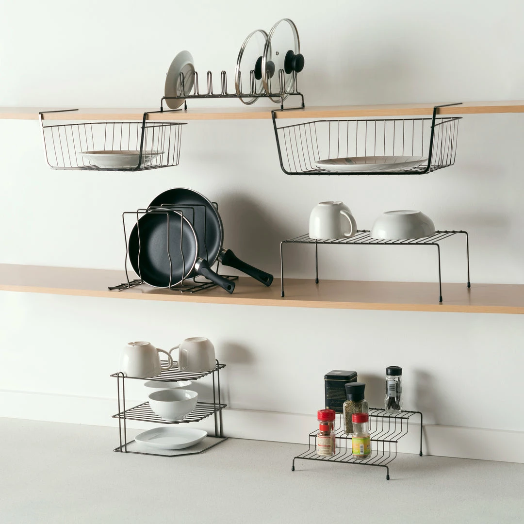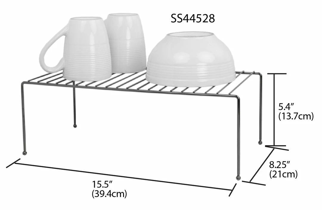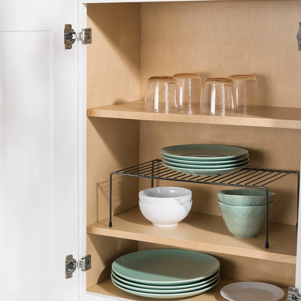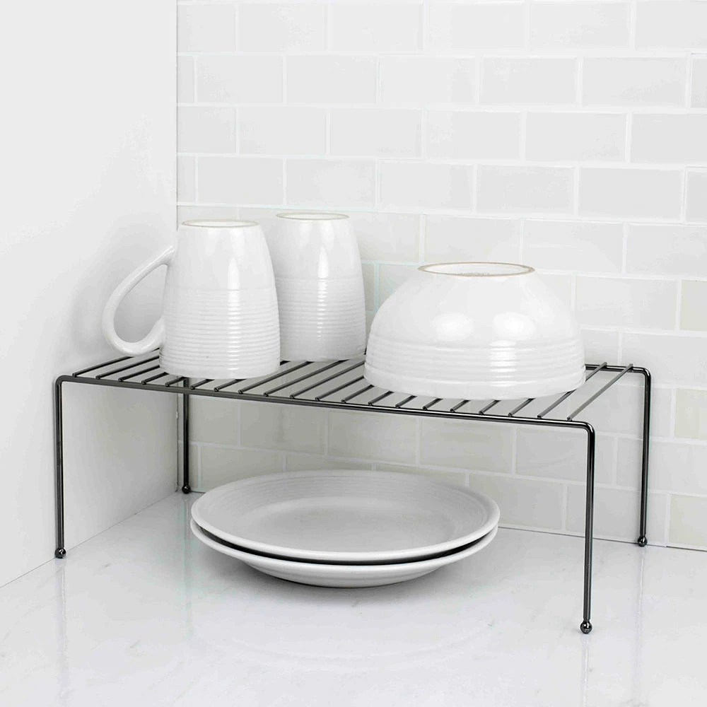 Store and organize plates, mugs, bowls, and other kitchen essentials on this helper shelf. Made from a black onyx steel finish. Increase your storage space by placing the shelf on the counter top or in a cabinet. Small profile keeps it out of the way but still holds a good amount of kitchen items. Looks great in any kitchen setting.