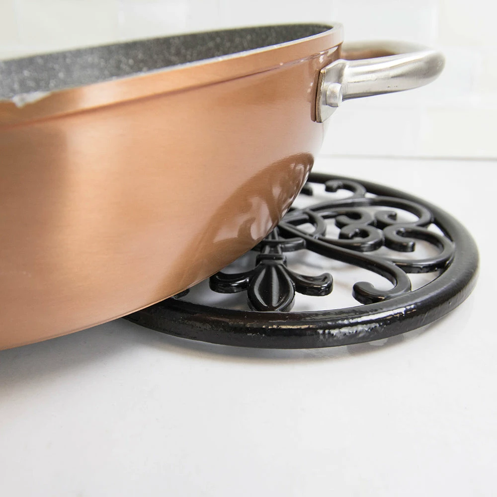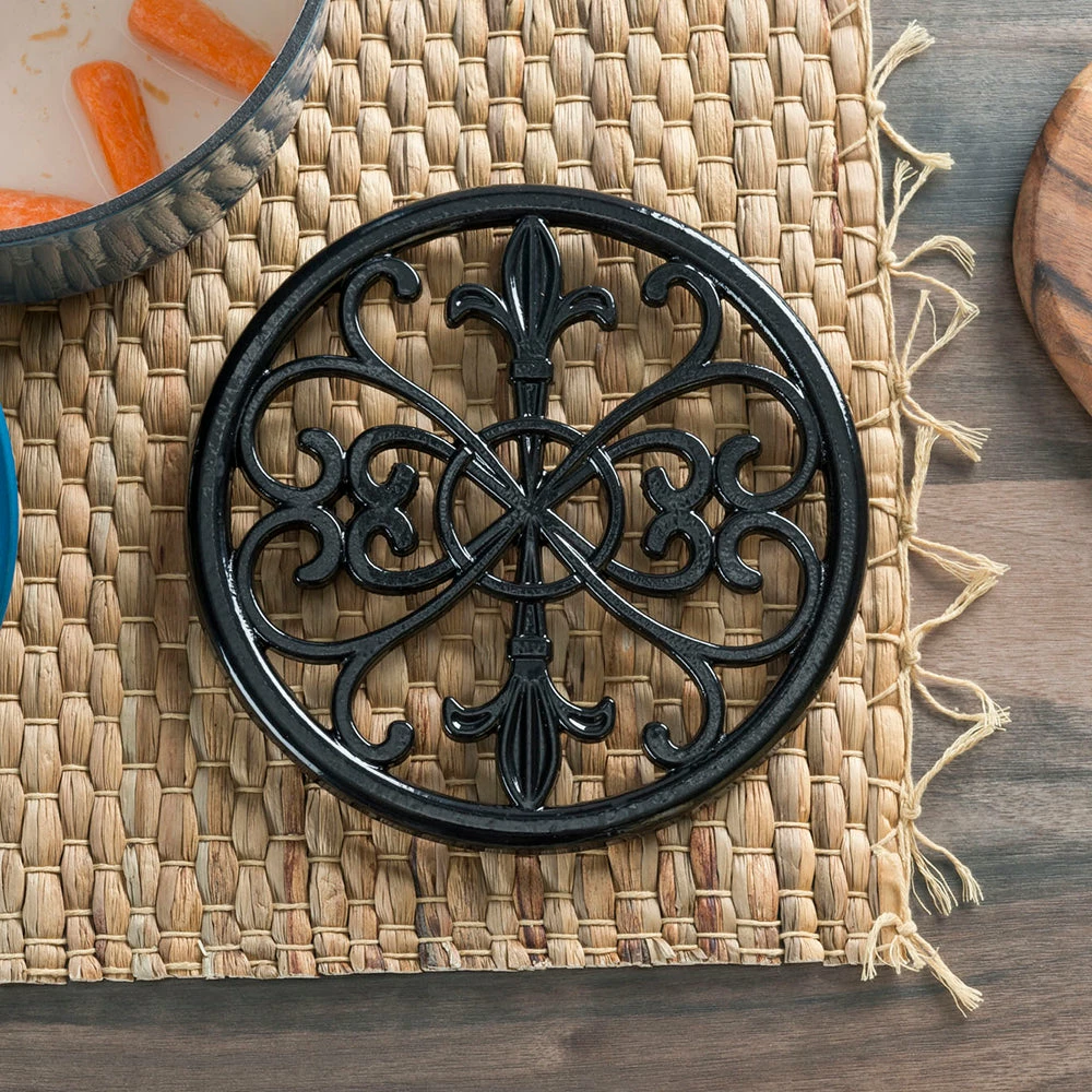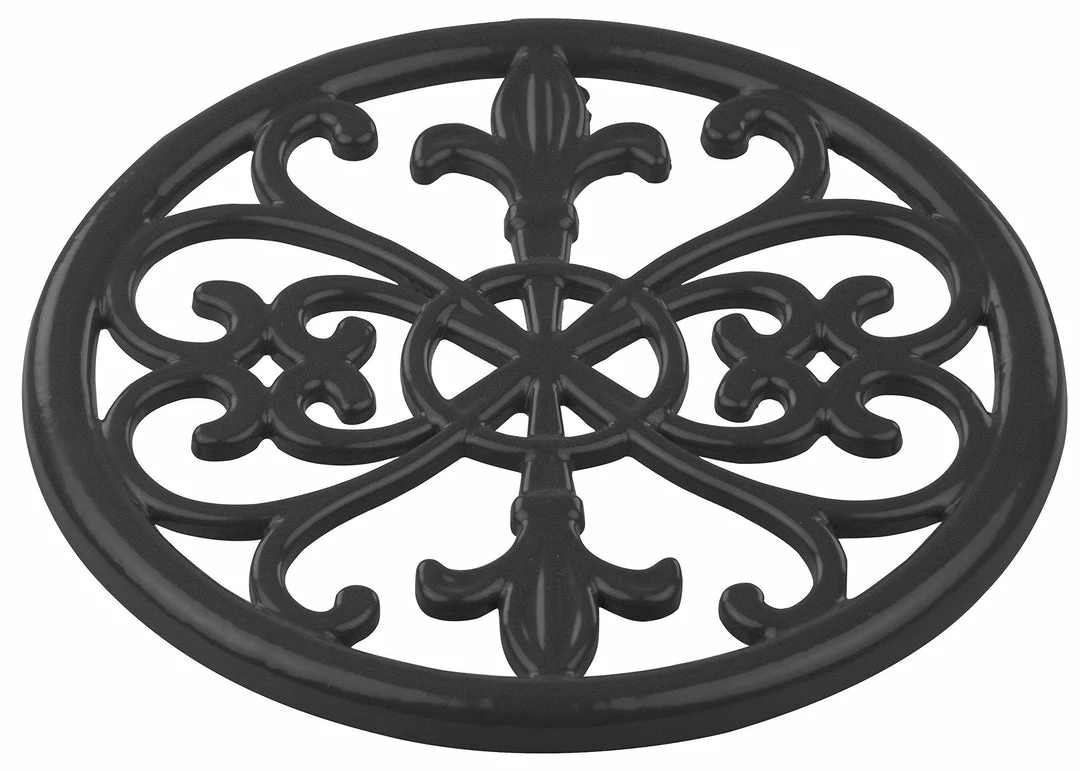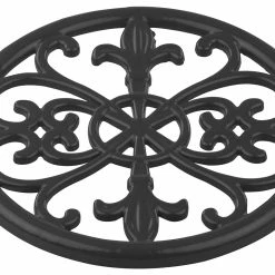 Enhance your kitchen decor and cookware with a charming chic flair by using this elegant trivet. Constructed of heavy duty cast iron with an enamel coating, it features a rounded base for ultra stability. It is great for holding sizzling hot pots and pans straight from the oven or stovetop, protecting your expensive counters and table tops from scratches and burns. With the timeless Fleur De Lis design, it works great as a decorative piece as well, creating visual interest. The black color also coordinated with your other kitchen appliances. Spot clean for easy maintenance.