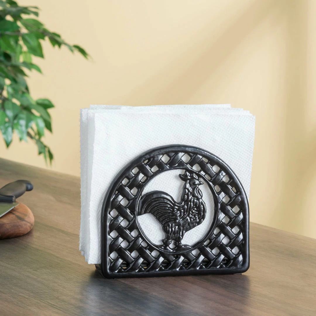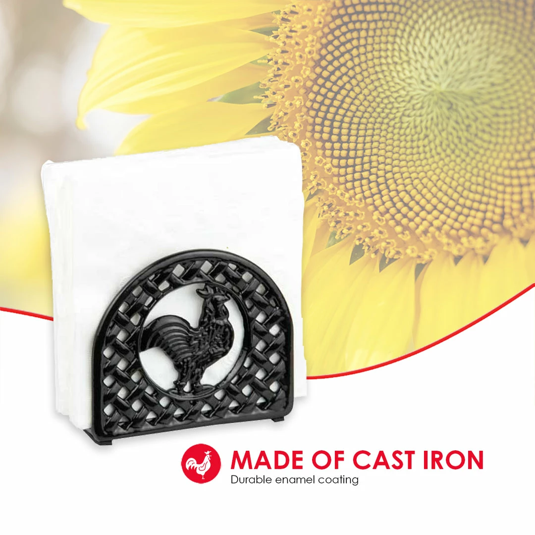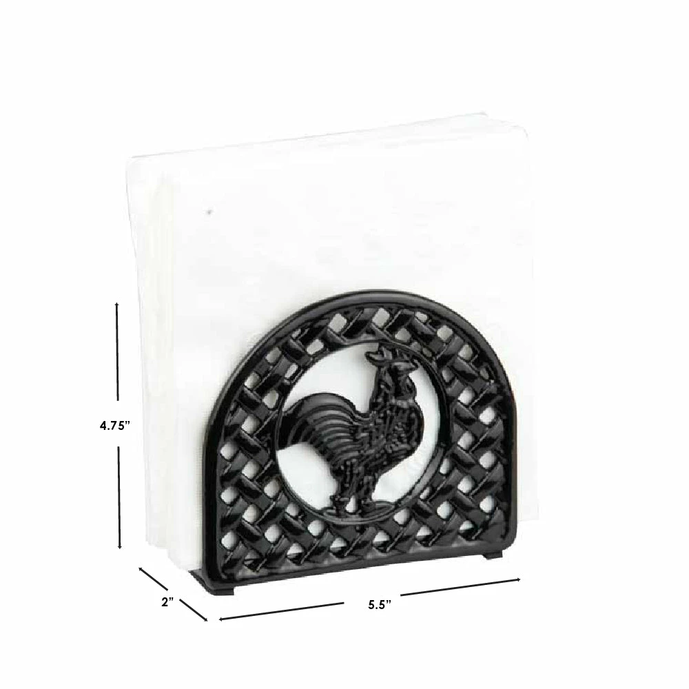 A great addition to a farmhouse kitchen, this napkin holder brings country charm to the kitchen with its fun rooster design. The napkin holder stands upright and positions all types of napkins in a vertical manner for easy access. Crafted from heavy duty cast iron, it’s great to use on breezy spring days outdoors and remains stable when pulling out napkins. Spot clean for easy maintenance.