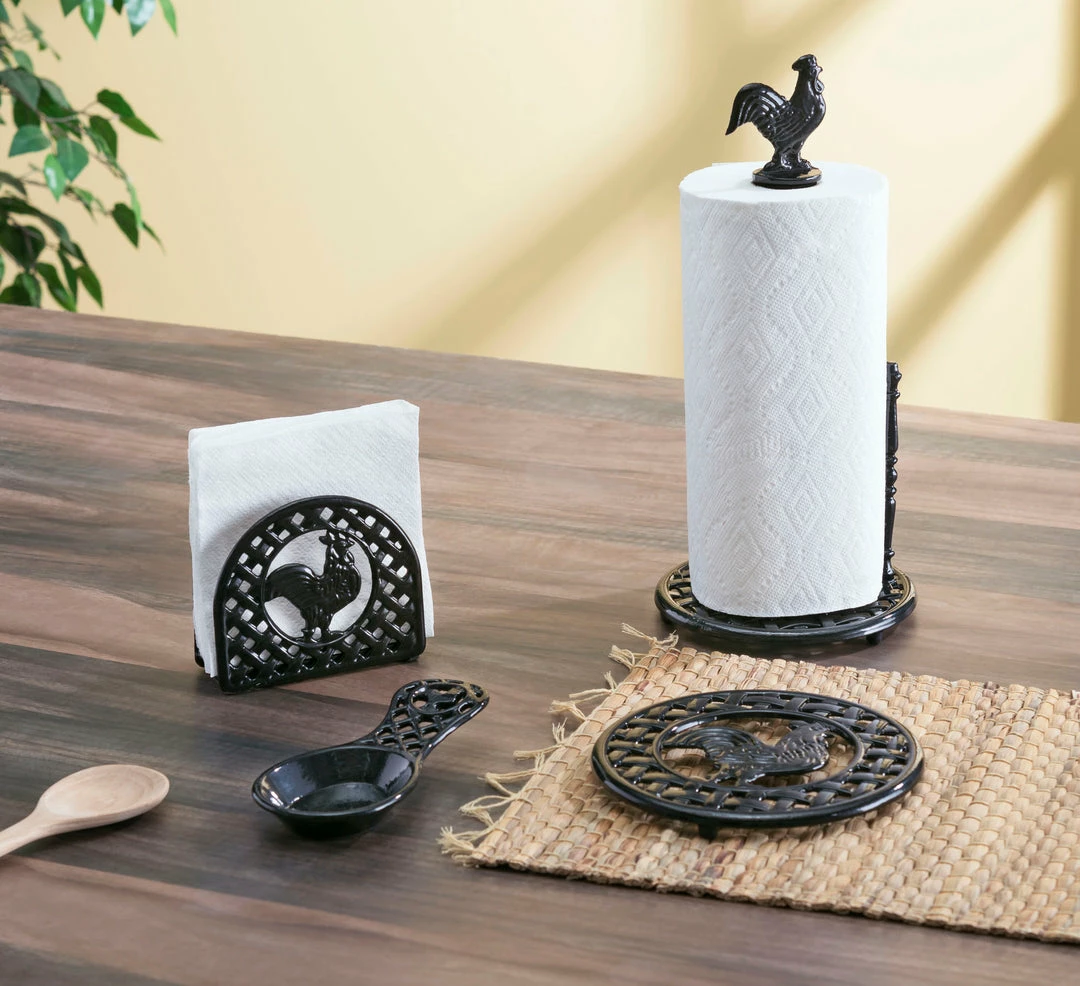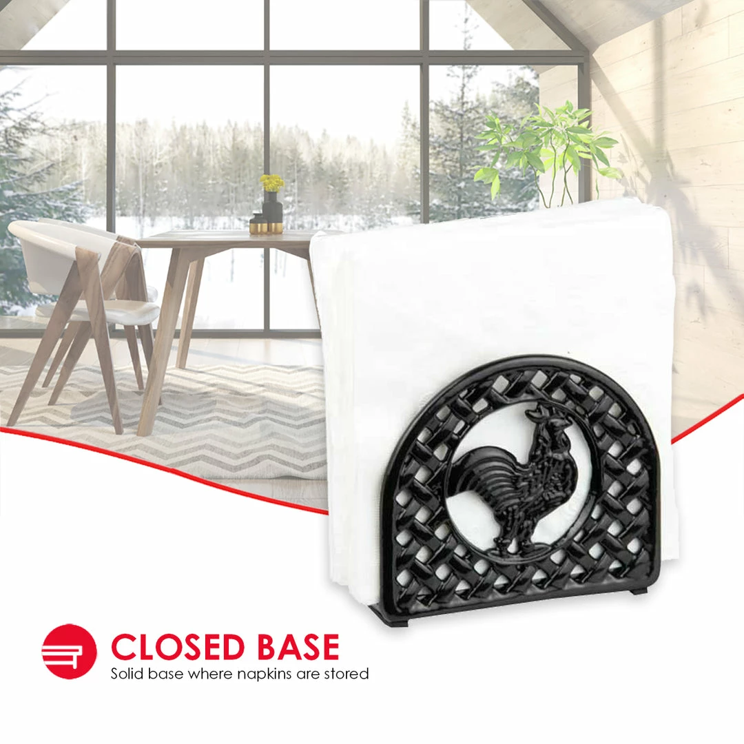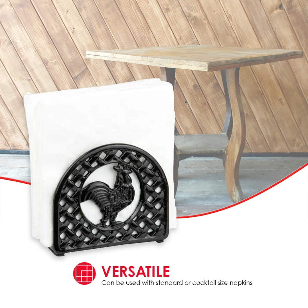 A great addition to a farmhouse kitchen, this napkin holder brings country charm to the kitchen with its fun rooster design. The napkin holder stands upright and positions all types of napkins in a vertical manner for easy access. Crafted from heavy duty cast iron, it’s great to use on breezy spring days outdoors and remains stable when pulling out napkins. Spot clean for easy maintenance.